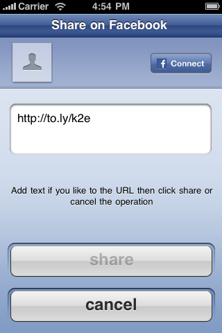 Long Story Short Squeezer allows you to shorten long URL's that you may have enjoyed and copied form safari, and then share it with your friends in Facebook and Twitter you may also send the shortened URLs as Emails and SMS's. all of that in one application. All you have to do is copy the URL From safari then launch Squeezer, and let the application do its things; the long URL get magically shortened. You also have the choice to type in the long URL into the text field. Squeezer currently support four main shortening services: -http://bit.ly -http://to.ly -http://is.gd -http://RFly.me Squeezer can also be used as all in one status updater for both Facebook and twitter, so you don't have to use different application for each service to do only one simple thing; updating your status.