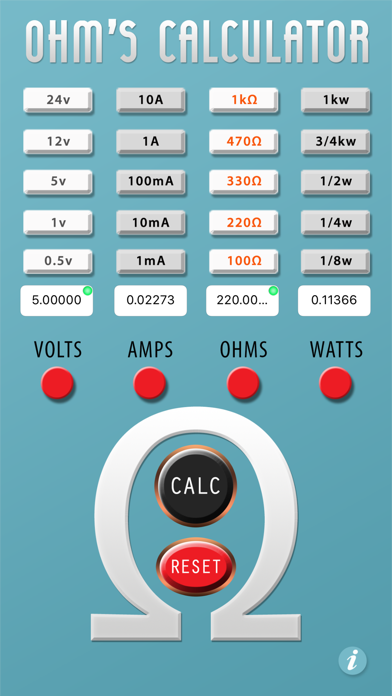 Ohm's Calculator allows you to enter any two values of resistance, amperage, voltage, or power and receive the remaining two values via Ohm's Law. Perfect for Electrical Engineering students or professionals, enter in the voltage, amps, ohms, or watts and receive the answers you need quickly! This app includes quick-buttons with standard increments of units/items in each category. These quick-buttons come in real handy. For instance, for a 660 ohm resistor, simply, tap the 330 button twice instead of having to pull up the keypad and type it in. An improvement over other Ohm's Law applications, this app allows you to clear only the two output values so you don't have to reset all the values and start over every time you want to change only one entry. In the value boxes you'll see a green dot for values that were manually entered so you don't forget which ones are 'fixed' when evaluating the results. Thanks for using Ohm's Calculator!