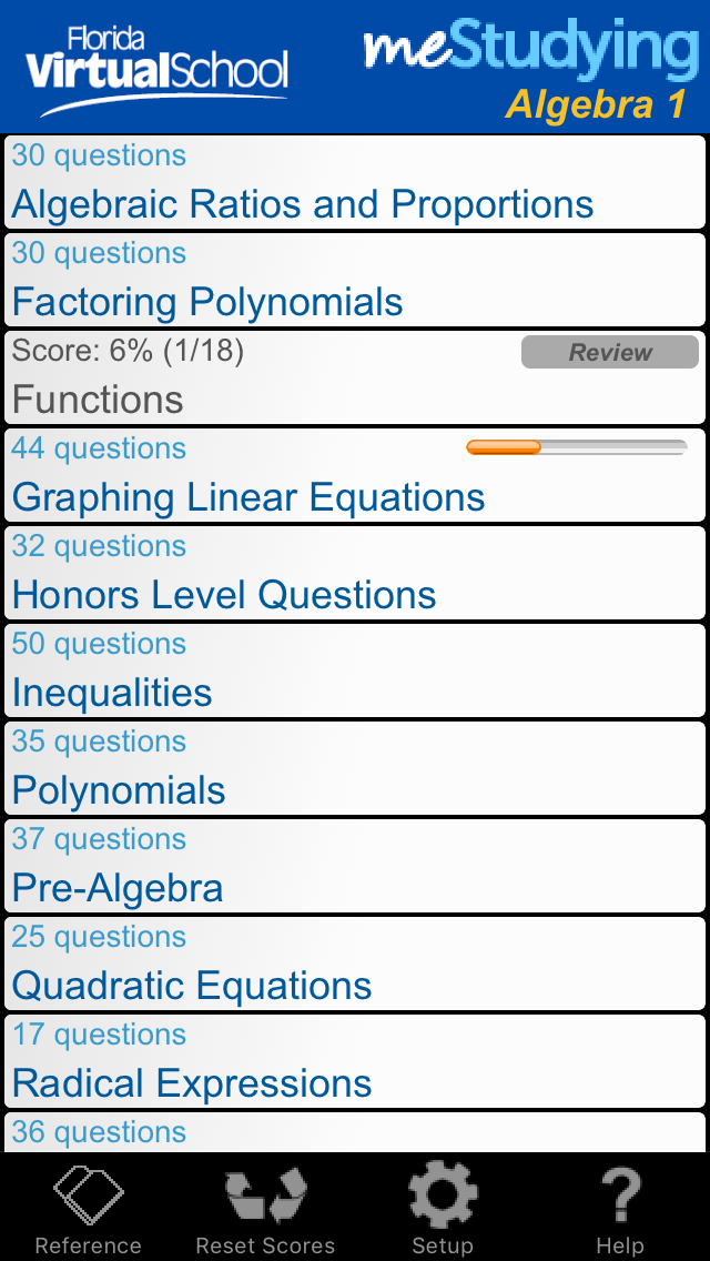 Practice your high school Algebra skills on the go! meStudying®: Algebra 1 allows you to easily choose a topic and interact with questions on your mobile device. Reinforce the concepts you've learned and be ready for the next test. Whether you want quick practice or a review of more detailed explanations, meStudying: Algebra 1 is here for you when you want it, where you want it. meStudying: Algebra 1 is brought to you by Florida Virtual School, the leader in K-12 virtual education. iPad features include calculator, scratch pad, and large layout design. Features · Content covers entire scope of high school Algebra 1 · Over 400 Algebra 1 questions · Immediate feedback · Detailed explanations for every question · Easily review all complete questions or only the ones you answered incorrectly · Sort by algebraic topic or FLVS Algebra 1 course module · Integrated reference guide · Easy navigation · Score tracking · Orientation locking