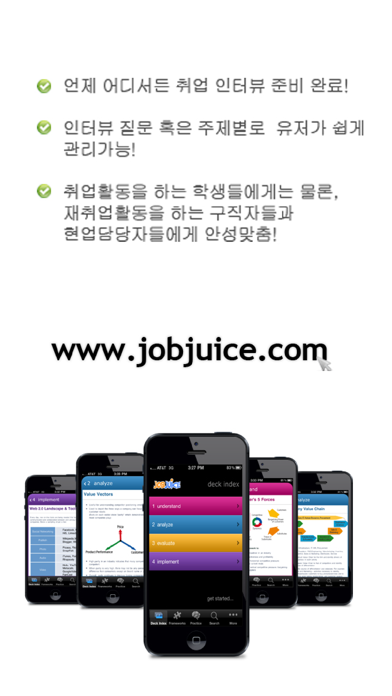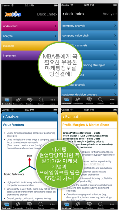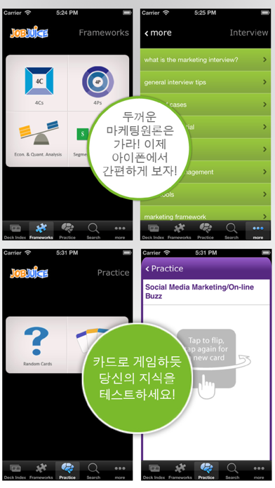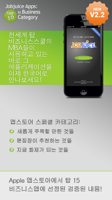 *** “What’s Hot”, “New and Noteworthy” and “Staff Favorites”***영어와일본어로도 보실수 있습니다!! (단말기의 설정언머만 바꾸세요) 전 세계 탑 MBA스쿨에 재학중인 수 천명의 학생들이 이미 사용했습니다! 언제 어디서든 당신의 면접을 준비하세요! 잡쥬스 마케팅 애플리케이션(Jobjuice Marketing App)은 어디서나 편리하게 마케팅에 관한 방대한 정보를 제공하는 현실적이고 효과적인 면접 참조 및 준비자료입니다! 구성/혜택: -마케팅면접의 개괄을 훑어볼 수 있음 -마케팅개념 및 프레임워크를 담은 50여개의 카드 제공 -마케팅 주제 혹은 면접질문에 따라 카드그룹을 생성가능 -무작위로 카드를 넘겨보면서 당신의 이해력을 테스트 -카드간 연관된 내용을 손쉽게 상호참조할 수 있음 -검색엔진에서 원하는 주제를 찾을 수 있음 웹사이트 (www.jobjuice.com)에서 마케팅애플리케이션의 데모를 보세요. 와튼, 하바드, 켈로그, 시카고, 스탠포드, 슬론, 런던비즈지스스쿨, 다든, 에모리, 기타 유수의 MBA 프로그램에서 취업준비를 위해 잡쥬스플래시카드를 활용했습니다. 이제 당신 차례입니다! 잡쥬스 인터뷰 준비 플래시카드는 사업개념, 전략 프레임워크, 인터뷰 팁을 통해 당신의 면접능력을 향상시키고, 특히 마케팅, 비즈니스, 인성/적성 관련한 어려운 질문들에 잘 대처할 수 있도록 훈련시킬 것입니다. 컨설팅, IB(investment banking), 마케팅 커리어를 꿈꾸는 구직자들에게 아주 이상적인 툴입니다. 잡쥬스(Jobjuice)의 창업자들은 와튼(Wharton)MBA학생들입니다. 금융, 컨설팅, 마케팅 커리어를 꿈꾸는 친구들의 면접준비를 돕기 위해 실질적으로 도움이 될만한 자료를 만드는데서 본 작업은 시작되었습니다. 실제 채용절차와 다양한 케이스를 접한 사람들의 지식과 경험이 사용하기 쉬운 형태로 재구성되었습니다. 본 애플리케이션은 창의력, 구조화된 사고능력, 빈틈없는 비즈니스 감각을 개발하기 위한 강력한 준비툴입니다. 전략적 마케팅과 비즈니스컨셉을 오가는 상호참조링크가 있는 50개가 넘는 주제별 카드 (아래 목차 참조)가 준비되어 있습니다. 잡쥬스 마케팅은 지난 10여년간 MBA 학생들이 자신들이 원하는 일자리를 찾는 데 지속적인 도움이 되어 왔습니다. 또한 본 자료는 현업에 있는 마케팅 담당자들에게도 도움이 될 것을 확신합니다. 목차: 마케팅 관리 마케팅 프레임워크 케이스 툴 4C 프레임워크 4P 프레임워크 경제 및 계량적 툴 STP(Segment-Target-Position) 거시경제환경 산업: 포터의 5 Forces 시장 및 경쟁다이내믹 제품수명주기 고객수용율 문제/기회요소들을 확인 회사분석 회사 벨류체인 경쟁자 분석 벨류 벡터 경쟁 포지셔닝 전략 인식맵 고객분석 고객의사결정절차 고객관계 고객지불의사 가침망 협력자 분석 가격분석 판촉분석 광고 및 PR 분석 유통(채널)분석 제품규격/믹스 분석 브랜드 분석 매출 원가 이익 및 시장점유율 손익분기 분석 수요예측 EVC 및 LTVC 세그멘테이션 타케팅 포지션 마케팅조사 기초 마케팅 조사 방법 컨조인트 분석 가격 실행 광고 실행 영업 실행 영업판촉 실행 유통(채널) 실행 해외확장 신규시장 진입 신제품개발 진입전략: 개척자 vs. 후발자 인터넷과 전략 인터넷 마케팅 웹2.0과 e마케팅 웹2.0 생태계 검색 마케팅 이메일 및 제휴마케팅 소셜미디어마케팅/온라인 버즈 e마케팅 평가