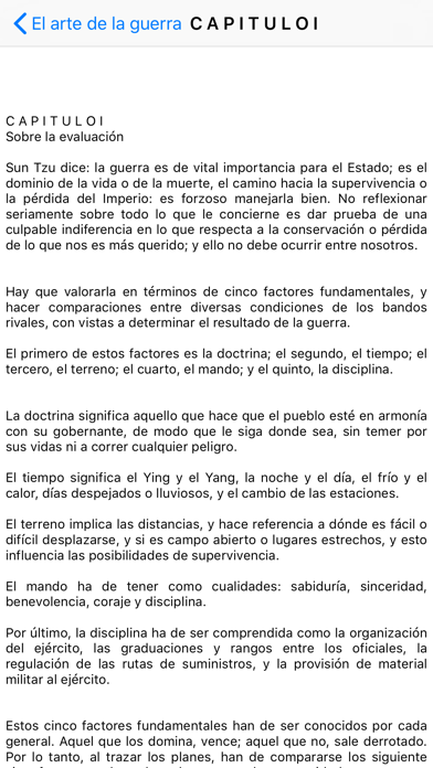 ¡Disfruta en tu iPhone, iPod touch o iPad uno de los mejores textos de la historia con una interfaz sencilla y ordenada, ademas le a pantalla completa y ajusta el texto al tamaño que desees! El arte de la guerra es un libro sobre tácticas y estrategias militares, inspirado por Sun Tzu, un famoso autor militar. Posteriormente a su escritura fue compilado en trece tomos por Sun Wu, uno de los discípulos de Sun Tzu, y finalmente el texto que se conoce en la actualidad fue escrito por Sun Pin un descendiente de Sun Wu. Se presume que probablemente fue escrito hacia el año 500 antes de nuestra era. Fue y sigue siendo estudiado por todos aquellos estrategas militares que han dirigido ejércitos, pero también ha servido de gran ayuda para todo aquel guerrero que ha emprendido el Camino. El arte de la guerra es uno de los libros más antiguos que se hayan escrito. Fue el primer intento conocido sobre lecciones de guerra. Sin embargo es todavía frecuentemente usado en la actualidad debido a que sus enseñanzas pueden ser aplicadas en muchas otras áreas donde está involucrado el conflicto. ---------------------------------> ¡La aplicación recuerda el tamaño de texto que habías elegido y la última posición donde leíste cada capítulo! Cambia el tamaño del texto con dos dedos (Como si dieras un pellizco, igual que en las fotos e imágenes). Lee a pantalla completa dando un doble golpecito ("doble tap"). ¡Descarga también otras aplicaciones de kubo Creations! ¡Y síguenos en Twitter! http://twitter.com/kubocreations And for US codes and english speakers: http://twitter.com/kuboLab