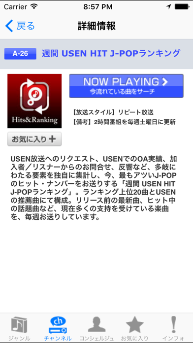 USEN 500chを超えるチャンネル数を誇り、日本国内の業務用BGMで最大のシェアをもつUSEN音楽放送の 番組内容や、今流れている楽曲の曲名、アーティスト名を確認できるアプリケーションです。 ヒットチャートの検索やロケーションに合う番組の提案機能もあります。 特徴 ・誰にでもわかり易い簡単な操作で、USENのすべての番組内容が検索できます。 ・各番組内で、今現在流れている楽曲の曲名とアーティスト名をリアルタイムで表示するNOW PLAYING機能があります。 ・USENのチャンネル番号や音楽ジャンルからの検索の他に「カフェ」「居酒屋」などのロケーションからの検索や 「爽やかな昼を演出」「気分を盛り上げたい時」といったシチューエーションに合わせた音楽(番組) の提案機能もあります。 ・聴取者はもちろん、音楽業界も注目する、USENの最新ヒットチャートが検索できます。 ・USENはUSEN音楽放送の番組情報を検索/確認するアプリです。 ※USEN音楽放送を聴く事は出来ません。 ※初回起動時やNOW PLAYING情報を確認する場合には通信環境(ネットワークへの接続)が必要です。