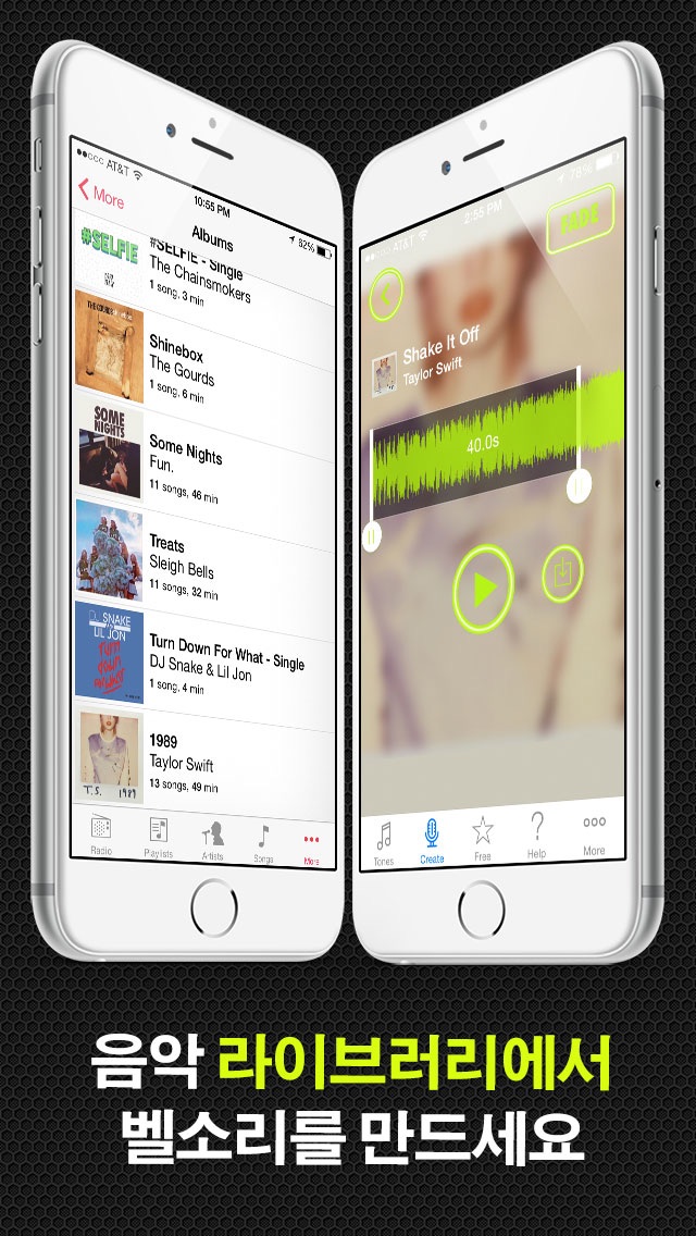 좋아하는 음악을 벨소리로 바꾸세요 (또는 경고음) 좋아하는 음악에서 벨소리를 만드세요 보너스! 미리 새롭게 만들어진 벨소리와 경고음도 포함하고 있습니다 돈 절약하기 자신만의 벨소리를 만들고 돈을 절약하세요 벨소리를 무제한으로 만드세요 벨소리 돈내기를 멈추세요 간단한 사용법 음악 라이브러리에서 벨소리를 고르세요 시작 시간과 중단 시간을 선택하세요 저장하기 – 끝입니다! HD 품질 완벽한 품질 벨소리 만들기 풍부한 베이스가 있는 스테레오 벨소리도 기록하기 녹음하고 벨소리 만들기. 친구, 아이, 부모, 재미있는 TV나 영화 인용 녹음하기. 벨소리나 경고음으로 바꾸세요 발신자에 해당하는 벨소리 만들기 친구나 연락처를 위한 독특한 벨소리 만들기 누가 전화를 거는지 알 수 있습니다 친구들을 위한 벨소리를 만드세요 어머니, 아버지, 친구들, 남자친구나 여자친구, 남편이나 부인을 위한 무료 벨소리를 만드세요. 친구들도 좋아할 겁니다! 주의: DRM-보호된 M4P 음악이 호환되지 않습니다. 2009년 이후, 1위 벨소리와 알람 소리 앱 개발자에 의해 세부적으로 만들어졌습니다.