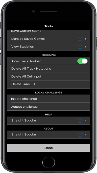 Billions of unique puzzles created from scratch in real time. Game levels between 17 - 80. Each level corresponds to the number of given numbers (clues). Game levels 17 -26 with four additional choices, "Easier", "Easy", "Hard" and "Harder". Local Challenge. Play the same game against peers in real time. Undo/Redo. Hints. Check for incorrect input. Path tracking/subnotes on cell input. Save and reload puzzles. Autosave on Exit. View/Reset statistics for each gaming level. Normal games, random games and games with cross-diagonal solutions, 9 rows by 9 columns + 2 diagonal. All non-Random games are 'one solution' games. Support for iPad keyboards - Magic & Smart and external Magic keyboards.Most functions can now be performed with keyboard input. Keep the input keypad visible during the game.