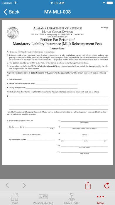 This is the official iPhone App for the Alabama Department of Revenue Motor Vehicle Division. It brings the capabilities and information of the MVD website right to your pocket. Use your iPhone to: - View the different available license plates styles (now). - Personalize your own tag and see how it would look all from your phone. - Get county by county office information. - Contact the Motor Vehicle Division. - Complete mandatory liability questionnaires (MLI). - Locate nearby DMV’s using your current location. - Get directions and maps to DMV locations. - Download state forms.
