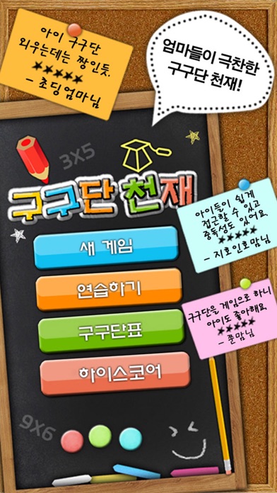* 아이와 부모를 위해 * 구구단표와 연습모드를 이용하여 구구단을 처음 접하는 아이가 쉽게 구구단과 친해줄 수 있도록 했습니다. 이제, 9단, 12단에 이어 19단 곱셈도 익힐 수 있습니다. * 모두를 위해 * 아이만을 위한 앱이 아닙니다. 엄청난 중독성에 곱셈이 이렇게 재밌을 수 있다니! 놀라실 겁니다. Perfect가 반복될 때마다 점수가 극적으로 증가합니다. 최고점에 도전해 보십시오! 1. 교육용 + 게임용 - 아이가 게임을 통해 구구단을 배울수 있게 합니다. - 전 가족이 즐길수 있습니다. 2. Game Center - 게임 센터에서 자신의 랭킹을 확인해 보세요. - 할 수 있다면, Achievement 도 모아보세요. 약간의 운이 필요합니다. 3. Perfect Runs - Perfect를 이어가는 한 게임은 계속됩니다. Perfect를 얼마나 이어갈 수 있을지 도전해 보세요! 4. 구구단표 - 구구단표를 보며 암기를 도와 줍니다. 5. 연습모드 - 연습모드에서는 순차적으로 암기할 수 있도록 도와줍니다. - 연습할 단을 선택할 수 있습니다. 힌트: 점수 공식 - 점수 : [남은 시간]x10 + [정답]x[연속된 퍼펙트 회수] - 퍼펙트를 계속하면 점수가 드라마티컬하게 높아집니다. 보너스판에서는 퍼펙트를 계속하면 무한히 게임을 계속할 수 있습니다.