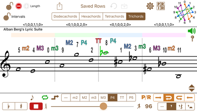 An extensive music composition and analysis tool. An indispensable resource for any musician or music teacher interested in dodecaphonic and set theory analysis. • Enter a tone row by touching the staff or playing the piano keyboard (on iPad). • It lets you know if any notes are repeated by highlighting both notes, checking enharmonic values regardless of octave or accidentals. • Automatically creates the Prime, Inversion, Retrograde, and Retrograde Inversion Magic Square. • Constantly updates the Interval Vectors and Circular Analysis of the tone row as you edit it. • Save your rows (rows may contain from 1 to 12 notes), complete with name and current P, R, I, RI matrix markings. Saved rows appear in a list with their name and midi numbers to help you identify them. • Share a pdf of the notation, piano keyboard (iPad only), and circular analysis. • Watch and listen to your row played with a selected rhythm pattern. • Playback: - Prime - Prime then Retrograde - Retrograde then Prime - Retrograde - Inversion - Inversion then Retrograde Inversion - Retrograde Inversion then Inversion - Retrograde Inversion • Each can be repeated and transposed with each iteration. • The Root is kept within an octave above and below the original pitch when looping and transposing. • Matrix Audio: Hear the pitches as you mark them in the matrix square. The marks indicate the row form in which the pitch belonged; Prime, Inversion, Retrograde, and Retrograde Inversion. • Lock the prime row and transpose it to C to use the Absolute Pitch Method for row labeling in the matrix. Comes preloaded with the following rows: Alban Berg's Lyric Suite Babbitt's Composition for Four Instruments Schoenberg's Variations for Orchestra Op.31 Schoenberg's Piano Piece Op.33a Webern's Concerto Op.24 Webern's Piano Variations Op.27 Webern's String Quartet Op.28