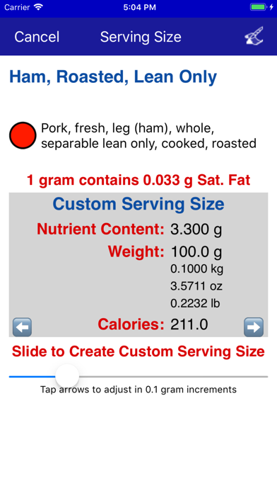 iSatFat is one of 10 iNutrient apps based on the USDA National Nutrient Database. The others include: - iCarbs (Carbohydrates) - iCholesterol (Dietary Cholesterol) - iFiber (Fiber) - iKals (Calories) - iPotassium (Potassium) - iProteins (Proteins) - iSodium (Sodium) - iSugars (Sugars) - Vitamin K (Vitamins K1, K1D & K2) Users can record their intake for any food. The information is maintained for one year and is presented in reverse chronological order grouped by day, so the latest data is presented first in the list. Editing allows for: 1) changing the number of servings; 2) changing the date; and 3) deleting records. Individual Intake Items can be copied to the current day, and all Intake Items for a single day can be copied to the current day. For those working towards healthy eating, knowing the amount of saturated fat in the foods available for consumption can be extremely helpful. The iSatFat app provides information about foods and how they are rated for content of saturated fat. This is provided as a means to assist in deciding which foods to eat. The food servings are rated from EXTREMELY LOW in fiber all the way up to EXTREMELY HIGH. The following colors help readily identify which is which: - Black = Rated EXTREMELY HIGH in Saturated Fat (10.001 - 33.000 g) - Dark Red = Rated VERY HIGH in Saturated Fat (5.001 - 10.000 g) - Red = Rated HIGH in Saturated Fat (3.001 - 5.000 g) - Orange = Rated MODERATELY HIGH in Saturated Fat (1.001 - 3.000 g) - Yellow = Rated MODERATE in Saturated Fat (0.501 - 1.000 g) - Light Green = Rated MODERATELY LOW in Saturated Fat (0.101 - 0.500 g) - Green = Rated LOW in Saturated Fat (0.011 - 0.100 g) - Cyan = Rated VERY LOW in Saturated Fat (0.001 - 0.010 g) - White = Rated EXTREMELY LOW in Saturated Fat (0.000 g) Essentially, the cooler the color, the lower the amount of Saturated Fat, with white being the coolest color and black being the hottest (think burnt). There are eight tables listing food servings: - All Foods - Fast Foods - Fruits & Vegetables - Meat, Fish & Shellfish - Dairy & Egg - Cereal Grains & Pasta - Sweets - Snacks The All Foods list allows you to search by any word or partial word from all the Food Titles. Selecting a food in any of the tables will display pertinent information about the selected food serving: - Food Title - Weight (in grams) - Common Measure (serving size for weight) - Saturated Fat Content (in grams) - Calories - Percentage of Saturated Fat by Weight (if at least 1%) - USDA Description - USDA Food Group - USDA Nutrient Database Number Information is derived from the USDA National Nutrient Database for Standard Reference: Fatty acids, total saturated Content of Selected Foods per Common Measure. There are currently over 1,100 different foods included, searchable using more than 2,500 names (some foods are known by different names or how they are prepared, e.g., "Egg, Scrambled" and "Scrambled Egg"). A few these have as many as six searchable names. The iSatFat Info screen provides access to additional information pages: - What is Saturated Fat? - Why Avoid Saturated Fat? - Highest Saturated Fat Foods - How to Use this App - Nutrients Custom Food Definition (another app with more features and data for 10 nutrients) - Other Important Info (includes allowance to 1) Report a Problem; 2) Ask a Questions; and 3) Make a Suggestion)