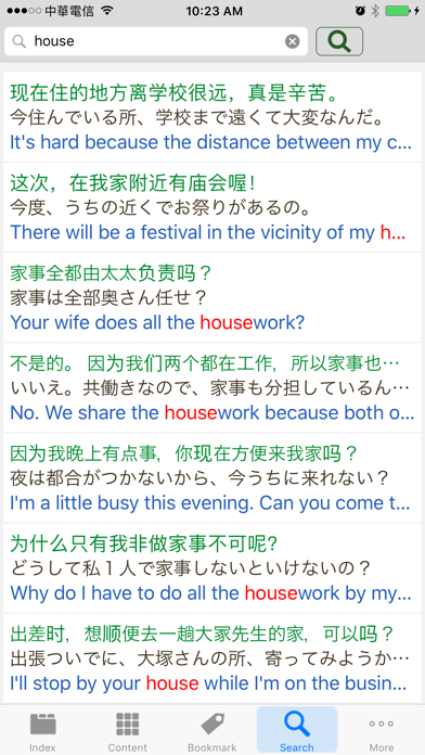 Frequently used daily conversations and expressions are carefully selected with human readout in 3 languages, Chinese, English and Japanese. The 3-in-1 dictionary is a handy helper in travelling, overseas studying, business trip and self-study on everyday conversations. A must-have app on your business/leisure trip to Japanese or China. You can't miss it! The Dictionary collects informations and terms in festivals, foods, special products, and many others. It's a must-have for your touring or shopping in Japan. Rich Dialogues & Phrases Texts and phrases in conversations are edited in Chinese, English and Japanese, also with human readout in 3 langauges. You will have good command of the language(s) in daily expressions, such as taking transportation, shopping, dining and travelling...etc. Chinese with Pinyin All Chinese characters are displayed with Pinyin expression, a best tool for learning Chinese language. Japanese Kanji with Hiragana script All Japanese Kanjis are displayed with Hiragana script, making the learning of pronunciation easier. Bookmark You can save sentences or phrases to the bookmark for future review. Contents in the bookmark are easily managed. Keyword Search You can use keyword to search for related sentences or phrases. Keyword search makes it easier to find required sentences or phrases.