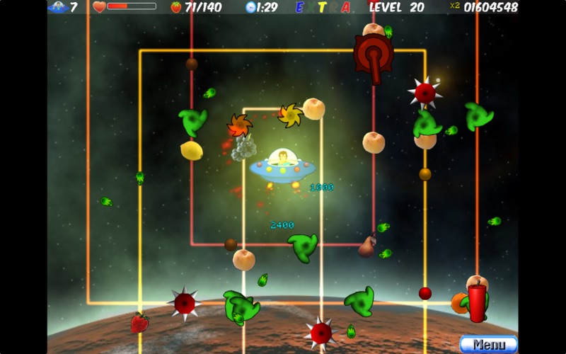 Welcome to Fruity Paths, a unique and fun new game! You play as Pip, who must fly his spaceship to different levels to collect fruit that is moving along paths. However, enemies are also moving along the paths, and will try to destroy Pip's spaceship! Playing Fruity Paths is easy and simple: just click on Pip's spaceship and then move him freely in any direction and at any speed with the mouse, the goal is to collect a required amount of fruits before time runs out, also you can collect different items to help Pip defend against the enemies or gain rewards and score bonuses. Features: - Unique gameplay. - Great graphics. - Great Music and SFX. - 50 Action Levels. - Lots of weapons. - Lots of items to collect. - 3 Difficulty settings. - Play Fullscreen or windowed. - Save game and resume later. More info at www.boviosoft.com