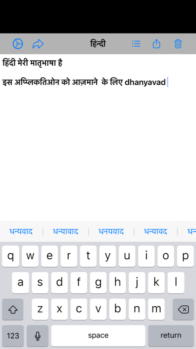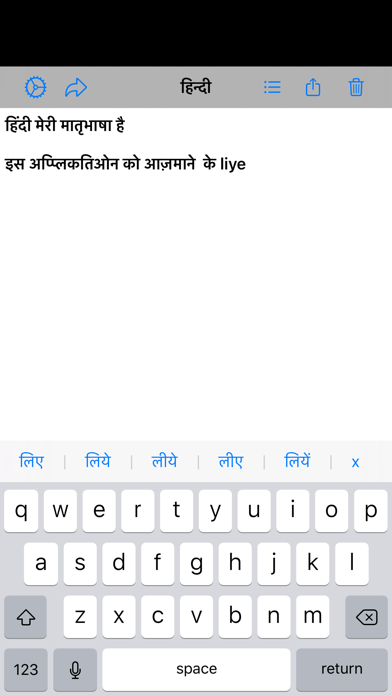 Using the Hindi Script Editor you can create Hindi text and share it to the world on Social Media from your phone or tablet. This is a very simple and easy to use application that translates the phonetically typed English characters you type into Hindi script. For each word typed phonetically in English, a list of matching Hindi words are offered. You can select one of them or choose to select the default selected option and go onto typing new word.