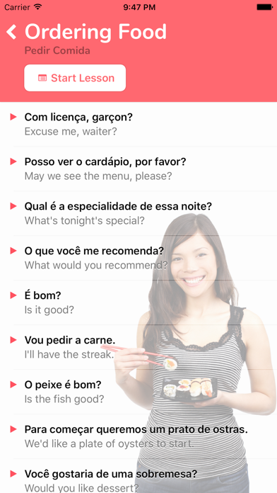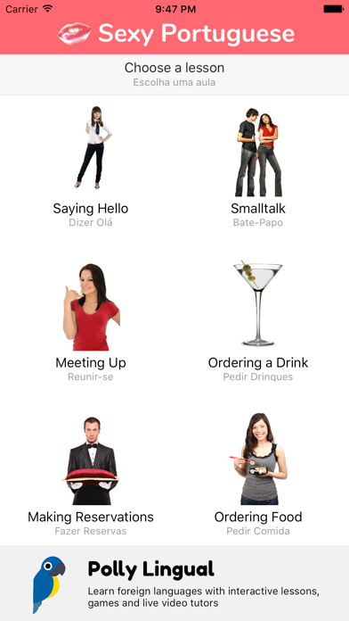 Want to meet a Portuguese speaker but don't know what to say? Sexy Portuguese teaches you the vocabulary and phrases you need to hook up, or at least avoid awkward silences when trying. Features Include: • Contains 12 audio lessons based on real situations • High-quality audio by native speakers • Designed inclusively for both straight and gay learners • Adaptive quizing algorithm for efficiency • Phrasebook for quick reference • Keep track of your progress • Use without an Internet connection • No hidden purchases Situation-Based Audio Lessons Include: • Saying Hello • Smalltalk • Meeting Up • Making Reservations • Ordering a Drink • Ordering Food • Relationships • Compliments • In the Bedroom • Body Parts • Physical Descriptions • Clothes