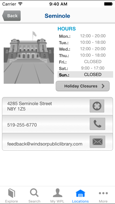 Take Windsor Public Library with you, wherever you go, 24/7. We make it easy to manage your account, search our materials, get branch information and hours and much more... Features: Browse bestsellers, new arrivals, and recent reviews Quickly search, with filters to zero-in on what you want Get descriptions and community reviews for titles Save titles to your 'For Later' list Check availability - and map the locations where your title is available now Instantly check your due dates and renew Place and manage holds Renew items Check branch hours Find and download ebooks and audiobooks