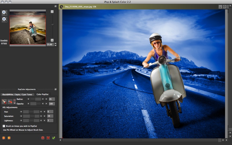 More than Splashing Colors, Create Gorgeous Blacks, Sepia or Cyanotype, Crop or Flip your Photos and more... With AppiSplashColors you turn your image in a vibrant Black and White, Sepia or Cyanotype(Blue) Color Combo and brush back to Color the areas you want to pop-out... • QUALITY!!!! AppiSplashColors has the most advanced algorithm to create the perfect Black&White or Sepia Tones. You can fine tune with your own color filter and create a rich Black and White image full of details! HumanSoftware has been doing color retouching software for more than 20 years! The black and white conversion we offer is WAY more sophisticated than any other 'splash' application and this is making a huge difference. Simply check out our screen shots and compare with any other... • Very unique blend to color that brings a unique dimension to the new black and white or sepia tone. • FAST, tune your brush easily to splash out your colors, resize your brush just with your mouse, no back and forth over your screen to find the correct radius! Powerful undo brush and visualisation of your selection... • Adjust your colors thru Hue Saturation Lightness to make your image even more vibrant! • Easily and visually ZOOM/PAN thru a navigator on your images for precise work. • No limitation to a certain picture size like other spash apps. • You can work with MULTIPLE images. Perform the effect on a batch of images... • You can in one click compare a before/after effect • Side by Side compare before/after effect • Ability to Crop Photos Before or After the effect is done. • You can directly save back to Aperture/IPhoto • Ability to add a Vintage Vignette effect • AppiSplashColors lets you save in JPEG, TIF, PNG, BMP, PICT, GIF, Photoshop format, you can even work/save 16bit color PNG/TIF/PSD images. Any questions, please do not hesitate to ask... We are highly dedicated to the quality of our tools and give support!