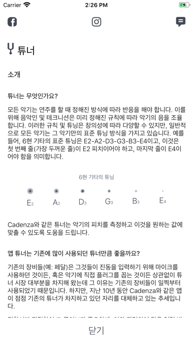 저희의 목표는 항상 초보자가 사용하기 편하면서도 노련한 음악인이 요구하는 바를 모두 충족할 수 있는 정확하고 유연한 앱을 제공해 드리는 것입니다. 8년의 세월이 지나고, 또 저희의 앱을 만족하신 고객 분들이 50만 명 이상이 된 가운데 버전 3을 통해 저희는 저희의 목표에 더욱 가까이 이르게 되었습니다. 핵심 사항 Cadenza는 최첨단의 고서능 알고리즘을 바탕으로 구현됩니다. 이 튜너(튜닝기)의 피치 범위는 A0에서 A8에 이르고, 반응 속도는 1,000분의 1초 아래입니다. 메트로놈은 분당 20에서 300 비트로 정확하게 작동됩니다. 사용자 인터페이스 저희는 간편함과 일관성을 염두에 두고 유용성에 초점을 맞추었습니다. 이를 통해 불필요한 디자인 요소들을 없앰으로써 사용자들은 정말 중요한 것들에만 초점을 맞출 수 있게 되었습니다. Cadenza의 사용자 인터페이스는 다양한 화면 크기 및 방향에 맞출 수 있어서 모든 장비에서 이전보다 훨씬 쉽게 사용할 수 있습니다. 에너지 효율성 저희 앱은 여러분의 배터리를 소모시키지 않습니다. 이것은 저희가 확실하게 보장할 수 있습니다. 저희는 많은 시간을 투자해서 최대한으로 에너지 효율성을 갖출 수 있는 설계를 완성하셨습니다. 전문 음악인을 위한 유연한 고성능 기능 전문가 사용자들을 위해 저희는 평균율, 피타고라스율, 순정률, 조 옮김, 그리고 다양한 디스플레이 관련 설정을 제공하고 있습니다. 초보자도 쉽게 사용 가능 Cadenza는 음악을 처음 시작하는 사람들과 이전에 튜너 또는 메트로놈을 전혀 사용해 본 적이 없는 분들에게 도움을 드릴 수 있는 다양한 튜토리얼과 사용자 가이드가 제공하고 있습니다.