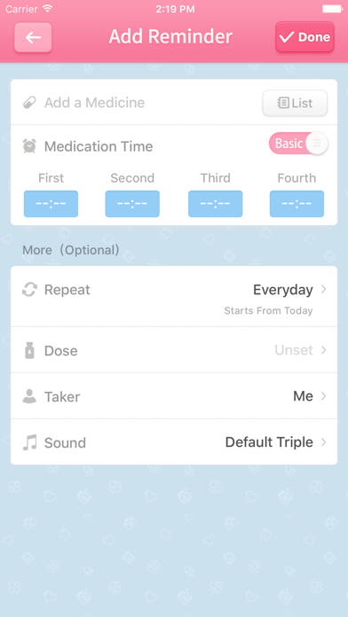 「iCare」 is an essential living app to remind you taking medcines on time, multiple reminders everyday, support notification center widgets, help you to find pharmacies and hospitals nearby immediately. It could be used to remind you taking Vitamins and Fruits as well ^_^ = Lovely Feature = 1.Powerful reminder:multi-cycle daily reminders, custom reminder cycles, "The Pill" cycle, to meet the requirements of all medication 2.Notification widgets: quick records medication timeline in notification center 3.Friends and relatives' medication: support Wechat、SMS and phone call to remind your friends and relatives 4.Family medicine: record medicine validity and doctor's advices 5.Location search: help you to find pharmacies and hospitals nearby immediately Proudly by Clover