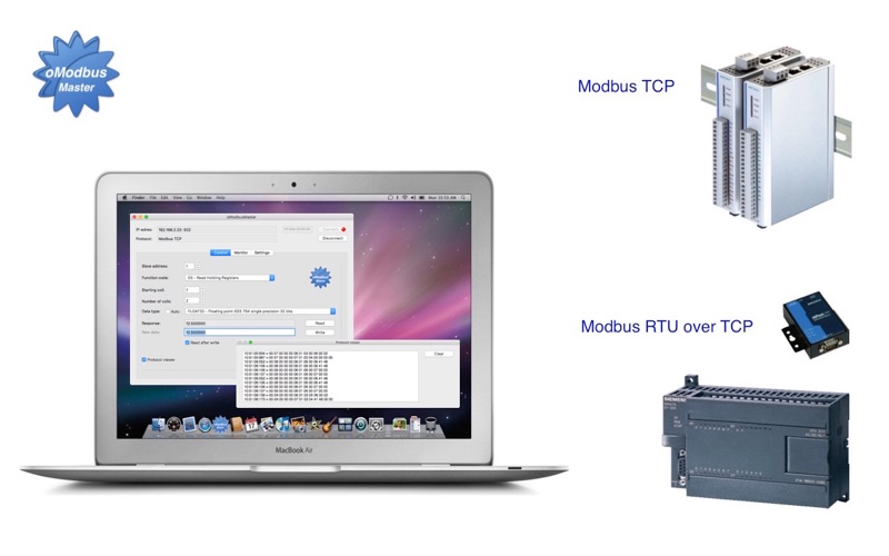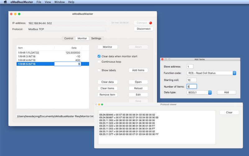 oModbusMaster is an easy to use low level utility for communication with Modbus devices, supporting Modbus-TCP and Modbus-RTU over TCP. For communication with RTU devices an ethernet to RS485 converter is needed.