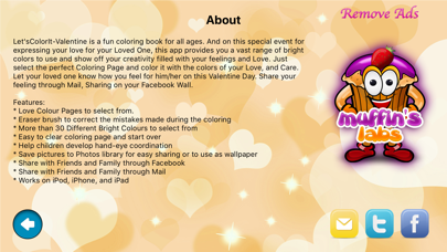 Let'sColorIt-Valentine is a fun coloring book for all ages. And on this special event for expressing your love for your Loved One, this app provides you a vast range of bright colors to use and show off your creativity filled with your feelings and Love. Just select the perfect Coloring Page and color it with the colors of your Love, and Care. Let your loved one know how you feel for him/her on this Valentine Day. Share your feeling through Mail, Sharing on your Facebook Wall. Features: * Love Colour Pages to select from. * Eraser brush to correct the mistakes made during the coloring * More than 30 Different Bright Colours to select from * Easy to clear coloring page and start over * Help children develop hand-eye coordination * Save pictures to Photos library for easy sharing or to use as wallpaper * Share with Friends and Family through Facebook * Share with Friends and Family through Mail * Works on iPod, iPhone, and iPad