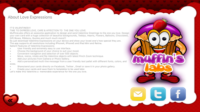 Expressing love has never been easy. But with Love Xpressions app, you can express your feelings and love for the one. Just select the perfect objects from the list and arrange with the perfect background, select the lovely wording and share it with your loved one through mail, or sharing on the Facebook wall. Features: * 8 Different Categories to select from i.e. Backgrounds, Teddys, Hearts, Balloons, Flowers, Quotes etc. * Each category contains 3 free items to select from. You can purchase more using the Buy More option from within the app. * Four different paid packages to select from depending upon your need. * Touch and Drag to place the Love Object anywhere on the Card. * Rotate Love Object to any degree using the multitouch feature. * Pinch zoom to increase or decrease the size of Love Object to any extent. * Double tap to remove the object from Card. * Save the card to photo album. * Mail the card to your loved one. * Display it on your Facebook wall for your loved one.