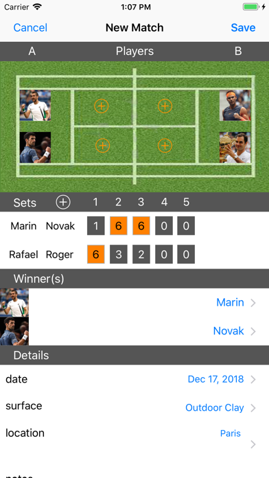 Tennis Player is a professional tennis App designed to help players, coaches and fans keep track of personal matches, tournaments, rankings, statistics and performance. All inside a beautiful and simple user friendly interface. Tennis Player is also an excellent source for ATP and WTA news, scores, video and rankings… all Live within the same App. You'll find that Tennis Player App is very powerful and one of the most complete Sport Apps available on the store. Use it to follow your tennis progress as well as others. Experience it on the go, while watching a match or after playing one with your friends !! Tennis Player features the following: • Add as many players as you want and know everything about them, including: PERSONAL - photo, name, nationality, sex, age, height, weight, character, racquet hand. SKILLS - serve, forehand, backhand, volley, condition, overall, strength CAREER - ranking, record, points, experience, career titles CONTACT - telephone, twitter/facebook NOTES - player notes • Advanced search bar for Players (name and country) • Add matches for singles or doubles, choose from existing players, add winner(s) and enter the match information, including: Unique record of sets, date of match, court surface, location (use GPS to get current match location) and notes. • Add Tournaments and enter it's details including: MAIN - photo, name, location, club, surface DATE - end & start of tournament PLAYERS - choose from existing players PRICE MONEY, RANKING POINTS & RESULTS - champion, runner up and third place • Rankings of your players database • Sharing - share your match results using Facebook/Twitter/Mail and more.. • Optimized for iPhone 6 and 6 plus • ATP and WTA Live - watch highlights, live scores, latest news and rankings.