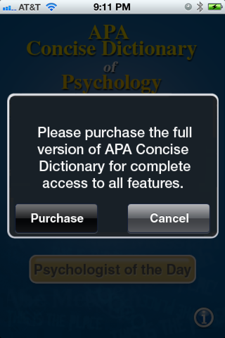 A pre-purchase version that samples 100 entries from the full APA Concise Dictionary app, an invaluable resource from the largest association of professional psychologists in the world. Familiarize yourself with the entry search and browse functions, see abbreviations and alternative spellings, add notes about definitions, and mark terms as favorites. Search term suggestions, search history, and a bookcase also are offered. Additional features available only in the full app include access to 10,000 comprehensive entries, direct linking between cross-references, and Word of the Day and Historical Figures in Psychology pop-ups.