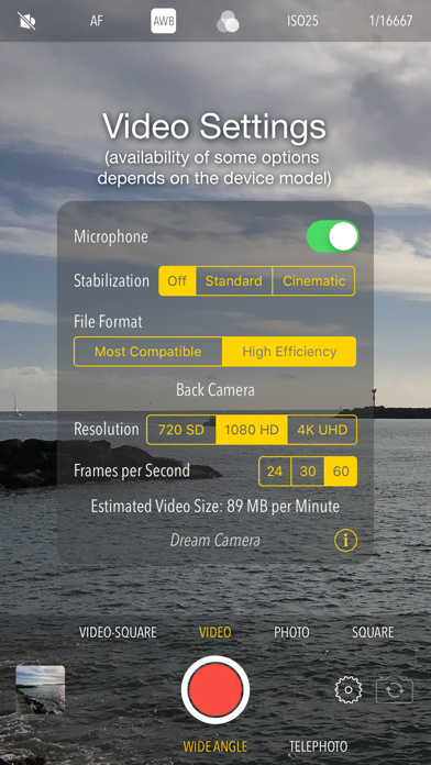 Features semi-automatic ISO mode, plenty of filters, white balance control and more Note the lite version adds watermark to the photos taken Exposure - Easy exposure compensation control with EV indicator. Just slide your finger up/down or right/left anywhere on the screen - ISO Priority. Tap ISO indicator and use the slider to set the value, shutter speed will be automatically adjusted. You can add exposure compensation to it as well. Flash/Torch Modes - On/Off or auto Focus Modes - Auto - Manual - set the value with the slider - Macro - Landscape White Balance Presets - Auto - Daylight - Cloudy - Shade - Fluorescent - Tungsten - Candle Filters - Effect: Dream, XPro1, XPro2, 70s, Art - Color: Normal, Black & White, Sepia, Redscale, Cyanotype - Contrast & Brightness: Light, Strong, Extreme - Edges: No Fading, Vignette, Mate Mix and match the filters from each category above Cameras - Front, Back, Tele and Ultra Wide (if available) Shooting Modes - Photo and Square Photo - Video and Square Video Photo Settings - Guide grid On/Off - Auto Photo Stabilization for longer shutter speed settings - Timer with 2, 5, 10, 20 or 30 second delay - Burst of 3, 5 or 10 photos; can be combined with timer - File format: JPG, PNG, TIFF or HEIF (if supported by the device) - Information about estimated photo file size Video Settings - Microphone On/Off - Stabilization Off/Standard/Cinematic (if supported by the device) - File Format: Most Compatible (H.264), High Efficiency (HEVC-H.265) (if supported by the device) - Resolution: 720SD, 1080HD, 4K UHD (if supported by the device) - Frames per Second: 24, 30 or 60 - Information about estimated video file size Browser - Photo preview and edit - Video playback - Scrubber bar to skim through your photos and videos - Sharing using standard iOS features Photo Editor - Orientation correction - Filter manipulation Dream Camera saves your photos and video directly to Camera Roll. You can access them either through the built-in browser or standard Photos app. Taking pictures is fun, enjoy it!