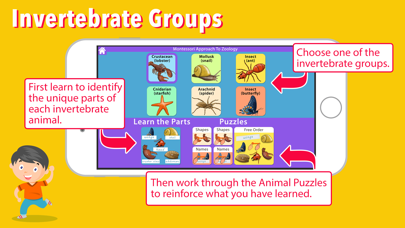 Learn the parts and names of different invertebrate animals. This app nicely complements the animal puzzles used in the Montessori Classroom! In Lesson #1 learn the parts and names of the different invertebrate animals. Touch an animal part in the photo-strip to change the featured animal part on the page. Touch the speaker button to hear the correct pronunciation of the animal part and touch the location button to see the animal part highlighted on the diagram! In Lessons #2 & #3 assemble the animal puzzle with pieces that are based on the popular physical Montessori materials: In the first animal puzzle lesson, children have to look for the animal puzzle piece that is blinking on the diagram. When they touch or drag the correct piece it will move into position on the diagram and the name of the part can be heard aloud. In the second animal puzzle lesson, children have to look for the animal puzzle piece that corresponds to the name shown at the top. For children who cannot read, the animal part name at the top can be touched to hear the name aloud for them to know which one to look for. This Montessori application was co-developed and approved by an AMI certified, Montessori teacher with over forty years experience educating children! We sincerely thank you for your support of our Montessori applications and hope you enjoy this one! Visit our website: http://www.mobilemontessori.org App page: http://www.mobilemontessori.org/partsofanimalsinvertebrates