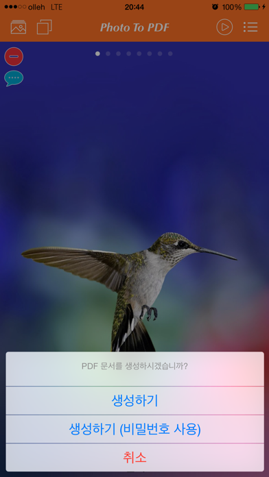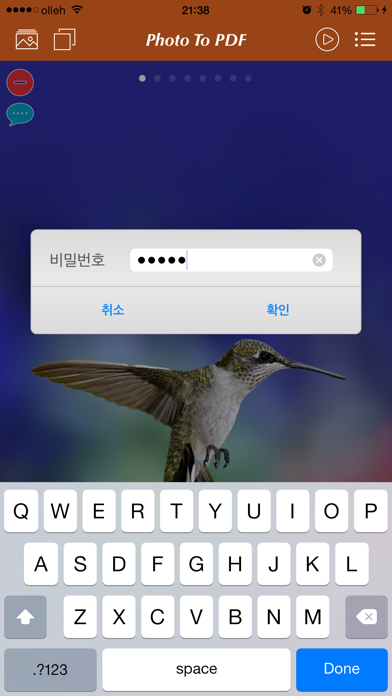 포토앨범의 사진들을 PDF 문서로 만들어서 보다 안전하게 관리하세요~ Photo to PDF 앱은 포토앨범의 사진들을 PDF 문서로 생성하는 앱입니다. 포토앨범의 사진들을 설명과 함께 사진을 찍은 지도 이미지와 주소를 포함하는 PDF 문서를 만들어 보세요~ 또한, 비밀번호로 보호된 PDF 문서로도 생성이 가능합니다. 비밀번호가 설정된 PDF 문서는 보기, 상세 보기, 삭제시에 비밀번호를 입력하셔야만 합니다. 비밀번호가 틀린 경우에는 PDF 문서를 보기 및 삭제를 하실 수 없습니다. 생성된 PDF 문서는 메일로 발송이 가능합니다. 또한, PDF 문서의 크기가 클 경우에는 압축을 한 후에 메일로 보내실 수도 있습니다. ◉◉ Photo to PDF 기능들 ◉◉ 1. 사진의 설명을 추가 가능 2. 사진의 위치 정보를 사용하여 지도, 주소의 사용이 가능 3. 생성되는 PDF 문서에 비밀번호 설정이 가능 4. 비밀번호가 설정된 PDF 문서는 비밀번호가 일치해야만 보기/삭제 가능 5. PDF 문서를 메일 발송이 가능 6. PDF 문서를 압축 후 메일 발송이 가능 7. 아이튠즈와의 파일 공유 기능 제공 8. URL Scheme : Photo2PDF:// 감사합니다.