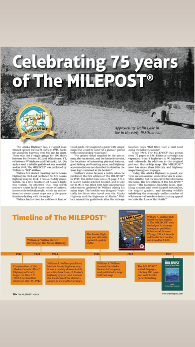 The MILEPOST® is Alaska’s best-known travel guide. Since 1949, the bible of North Country travel! The MILEPOST® continues to amaze travelers with its usefulness, while they travel northern highways. Now you can enjoy the same publication on your mobile or tablet device. This free app will allow you to make an in-app purchase of The MILEPOST®. With purchase, The MILEPOST® will be delivered straight to your device—660 pages of the same great content as the print version. Because of the size of The MILEPOST® it's important to allow the entire book to download to your device uninterrupted before you begin to flip through the pages otherwise the download may become corrupt and require internet access to view the pages. If this happens, delete the data and clear keychain for The MILEPOST® app in settings on your device and download the content again through The MILEPOST® app. The MILEPOST® continues to cover the Alaska Highway as well as all of the main road system highways in Alaska and primary routes in the western Canada Provinces, over 15,000 miles! Interspersed within the mile-by-mile road logs are nearly 700 photos, detailed maps of roads and communities, road conditions and travel tips. Within the pages of The MILEPOST® you will receive information that includes: *Alaska Marine Highway and B.C. Ferries. *Regulations regarding border crossings. *Detailed railroad tours. *Campgrounds and fishing locations. *Museums, cultural centers and much more. Buy The MILEPOST® today and begin planning your Alaskan adventure! Privacy Policy: https://www.themilepost.com/privacy-policy/ Terms of Use: https://www.themilepost.com/copyright/
