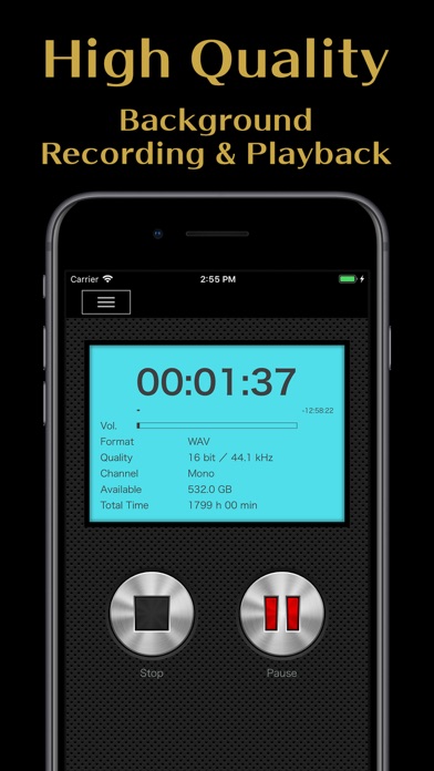 PCM Recorder Pro is the simple voice recorder that can record with the highest sound quality. Recording format can be selected from lossless compression PCM (WAV) and lossy compression AAC (M4A). If you synchronize with iTunes, you can retrieve the recorded file to your PC. Sampling frequency corresponds to 8kHz ~ 192kHz. The number of quantization bits can be set to 8, 16, 24, and 32 bits. Notes: - This App cannot record calls. - Data is not shared with PCM Recorder Lite. (It is possible to import by file sharing) Recording Functions: - Recording in high-quality linear PCM (WAV) format - Recording in high-compressed AAC (M4A) format - Background recording - Change sampling frequency (8 ~ 192kHz, WAV format only) - Quantization bit number change (8 ~ 32bit, WAV format only) - Bit rate change (64 ~ 256kbps, AAC format only) - Unlimited recording time (up to 2GB) Playback Functions: - Background playback - Create playlist - Rename file - Sort files - Repeat playback - Change playback speed (0.5x, 0.8x, 1.2x, 1.5x, 2.0x) - Playback 10 seconds forward, 60 seconds forward, 10 seconds backward, 60 seconds backward - 10 Band EQ - A-B section playback Other Functions: - Conversion from WAV to AAC - Cut out audio data and delete selected area - File sharing - Recover deleted files - Import recording data from other apps