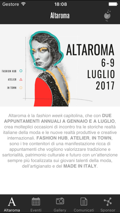 AltaRoma è la App ufficiale della Fashion Week capitolina. La App permette di: - avere il calendario aggiornato - avere la geolocalizzazione degli eventi - salvare un evento nella propria agenda - scaricare i comunicati stampa ufficiali di AltaRoma in pdf - visualizzare le foto degli eventi, degli abiti e degli accessori. - accedere ai canali social di AltaRoma - condividere tutte le informazioni tramite facebook, twitter o mail - ricevere news, novità e tanto altro mediante notifiche push AltaRoma crea molteplici occasioni di incontro tra le storiche maison italiane e le nuove realtà produttive e creative internazionali. Tradizione e sartorialità, patrimonio culturale e futuro: a Roma la moda porta nel suo DNA quel senso di lavoro manuale e di cultura materiale che oggi si concretizza nella neocouture. La App AltaRoma è il frutto della collaborazione tra App to you srl e AltaRoma SCpA.
