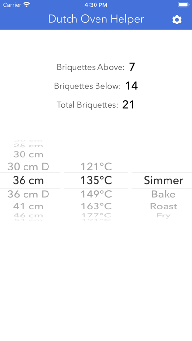 The Dutch Oven Helper is the fastest, simplest, and most user-friendly tool for calculating the number of briquettes needed for a dutch oven meal. Simply choose a temperature, dutch oven size, and cooking method and the Dutch Oven Helper instantly calculates how many briquettes to put above and below your dutch oven! You can also change from Fahrenheit to Celsius and from Inches to Centimeters.