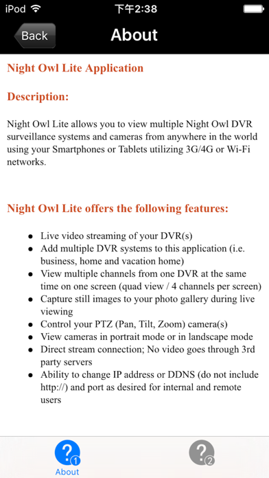 Night Owl Lite allows you to view multiple Night Owl DVR surveillance systems and cameras on your iOS or Android Smart Device. Keep an eye on your world, from anywhere in the world! Some bells and whistles: • Live video streaming of your DVR(s) • Add multiple DVR systems to this application (i.e. business, home and vacation home) • View multiple channels from one DVR at the same time on one screen (quad view / 4 channels per screen) • Capture still images to your photo gallery during live viewing • Control your PTZ (Pan, Tilt, Zoom) camera(s) • View cameras in portrait mode or in landscape mode • Direct stream connection; No video goes through 3rd party servers • Ability to change IP address or DDNS (do not include http://) and port as desired for internal and remote users Night Owl Lite application is compatible with the following Night Owl DVR surveillance systems: • TL, L, P & WMC Series (Any model number that starts with TL, L, P, and WMC) • LTE, BUL & STA Series (Any model number that starts with LTE, BUL, and STA) • Apollo Series (Any model number that starts with Apollo or B-APDVR) • Poseidon Series (Any model number that starts with Poseidon or B-PODVR) • Zeus Series (Any model number that starts with Zeus or B-ZE) • 4BL Series (Any model number that starts with 4BL or LB-4DVR) • 8BL Series (Any model number that starts with 8BL or LB-8DVR) • 16BL Series (Any model number that starts with 16BL or LB-16DVR) • NODVR108 Series (Any model number that starts with NODVR108) WARNING: This application uses a data stream that will connect to your DVR surveillance system. When using the 3G/4G network, the live video feed from your DVR will be considered "downloads" from your phone service provider and it will contribute to any download limit your phone data plan may have. If you exceed your data plan limit, this may result in additional usage charges. It is recommended to contact your phone service provider to know the limits of your data plan before using this video streaming application.