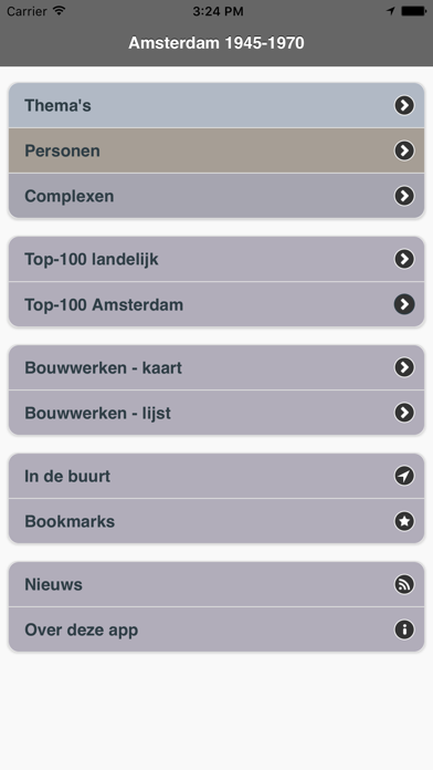 Bekijk in deze app de belangrijkste architectuur in Amsterdam uit de periode 1945-1970. De tijd van de wederopbouw en van de grote stadsuitbreidingen. Na de oorlog moesten her en der gebouwen herbouwd worden. Maar de grootste bouwinspanning was de uitvoering van het Algemeen Uitbreidingsplan, waarin de Westelijke Tuinsteden en Buitenveldert waren voorzien. De selectie is gebaseerd op de top-100-lijsten van monumenten van het rijk en van de gemeente. Er zitten uiteraard woningen tussen, maar ook veel scholen, kerken, bruggen en bedrijfspanden, en enkele woonwijken. De gebouwen zijn makkelijk te vinden via kaarten en via lijsten, gegroepeerd op functie en stadsdeel. Alle gebouwen zijn gefotografeerd en hebben een beschrijving. De app bevat ruim zeventig beknopte biografieën van de architecten die de wederopbouw en de stadsuitbreiding vorm hebben gegeven. Het zijn bekenden als Marius Duintjer en Mart Stam, maar ook vele minder bekende namen.