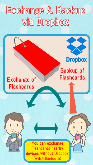 Just take a photo of unknown word in textbooks, newspapers or magazines, you can make flashcards of a word and the translation to Japanese/ Chinese. These question and answer can be entered by text input methods. And you can use photos as question and answer instead of texts. It’s good for preschool education to learn word by showing photo and asking the meaning of the photo. You can share the flashcards with your friend by using nearby communication or Dropbox. Functions: 1.Practices Flashcards are listed on a "Flashcards screen". Please select one Flashcards and choose " Practice" and options". (1)Practice After you imagine your answer, please push " Check" button. Then the correct answer will be shown. After comparing your imagined answer and correct answer, Please touch "OK" button or "NG" button based on the comparison. You would like to confirm an answer of the question before going to next question, you should touch "Check" button. Then the answer can be seen & confirmed. -Weakpoints only If you can not answer a question as "OK" three times in a row, the question is recorded as weak points question. -Random The order of questions are shuffled. 2. Edit (1)Add new flashcards in a flashcards list By touching "+" button on the upper-right corner on "flashcards screen", new flashcards are added. (2)Add a new card By touching “+” button on the “Edit screen”, you can add a new card which holds a pair of a question and an answer. If you touch a question field, you can select question input methods as follow; “Input text”, “Photo Library”, “Camera Roll”, Camera” and “ Image Recognition”. As same above, you can select answer input methods by touching an answer field. By touching the reverse button, you can exchange question and answer. (3)Image Recognition By selecting “Image Recognition”, video from iPhone camera will be displayed. The video screen has a recognition frame. Please set the word in this recognition frame, then the word( English) and translated word (Japanese/Chinese) are displayed near the frame. By touching the button labeled the word, the English word and translated word are recorded as a new flashcard. (4)Quick Input Mode from Photo You touch magic baton button in the bottom of the edit screen, you can make multiple cards from photo you choose. Please select photo source from Camera, Photo Album, Camera roll. You make double tapping on the word you want to know, the frame with text and its meanings is displayed on the word. If you returned to previous page (edit page), the words you tapped are entered as cards. 3. Other functions (a)remove flashcards By touching a trash button on the bottom of " Edit", the selecting flashcards will be deleted. (b)Set name for the new flashcards By touching an action button on the bottom of " Edit" and choosing edit the text name, you can change the name of the text. (c)change the order of the question By touching "Edit" button of "Edit" and dragging a question, you can change the order. (d)remove a question By touching "Edit" button of "Edit screen" and selecting a question, you can delete the question. 4. Upgrading functions (a)No page & flashcards limitation Free version is limited less than 5 and each flashcards can hold less than 10 pages. Once you buy the upgrade, these limitation will be deactivated. (b)Flashcards can be shared through nearby communication Two iPhones which already installed " camFlashcards" can share flashcards via nearby communication. (Bluetooth required) On the sending iPhone, select one flashcards which you want to send on "flashcards screen", push an action button of the "Edit screen", and choose "Send to nearby". On the receiving iPhone, push a "+" button on the upper-right corner of the "flashcards screen ", and choose "Receive From Nearby". (c)Dropbox communication You can save and load your flashcard data to/ from dropbox folder.