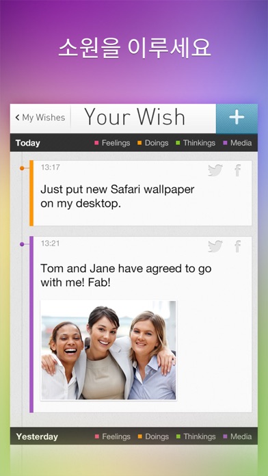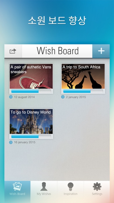 100개가 넘는 앱 스토어에서 제공됨 BestAppEver 어워드에서 최고의 앱 탑 3 차지 여러분이 하는 생각이 물질이라는 것을 아시나요? 소원에 대해 마지막으로 생각해 보신 적이 언제인가요? 아직 이루지 못한 소원이 있으시나요? 이러한 소원을 이루기 위해 노력하셨나요? WishLab은 꿈을 이루는 데 도움이 되는 일상적으로 사용할 수 있는 강력한 시각화 도구입니다. WishLab은 새로운 iPhone 얻기, 친구 사귀기 또는 흥미로운 일 시작 등 이루고 싶은 하나하나에 대한 노력을 기울일 수 있도록 동기를 부여합니다. 느낌, 생각, 행동의 힘을 통해 소원 이루기 소원 각각의 진행 상황을 추적하고 느낌, 생각, 행동을 기록하세요. 사진과 동영상을 추가하고 더 나은 시각화, 초점 및 상호 작용을 위해 소원 보드에 소원을 적으세요. WishLab에서는 목표를 달성하고 꿈을 이룰 수 있도록 이메일 알림과 푸시 알림으로 가장 중요한 사항을 미리 알려줍니다. 또한 Wall of Inspiration(영감의 벽)을 확인하여 다른 사람들이 이룬 소원을 통해 동기 부여를 받을 수 있습니다. 기능: - 소원 만들기 및 관리 - 소원을 이룰 기간 설정 - 사진, 동영상 및 메모로 소원 라이브러리 채우기 - 일상적인 생각, 느낌, 행동으로 진행 상황의 차트 만들기 - 소원을 이루기 위해 기억할 수 있도록 푸시 알림과 이메일 알림 받기 - 소원 보드에서 소원 시각화 - Wall of Inspiration(소원의 벽)을 통해 다른 사람들의 소원과 성취한 일들을 보고 영감 얻기 - 이룬 소원에 대한 일기를 쓰고 성공 스토리 공유 - Facebook 및 Twitter에서 생각, 사진, 동영상 공유 소원이 무엇이신가요? 화와이 휴가? 문신? 새로운 기타? 애완동물? 수학에서 A 점수 받기? 복권 당첨? 스쿠바 다이빙? 진정한 사랑 찾기? 돌고래와의 수영? 몸무게 빼기? 강남 스타일 댄스 배우기? 연예인 만나기? WishLab이 여러분이 꿈을 좀 더 수월하게 이룰 수 있게 도와드립니다!