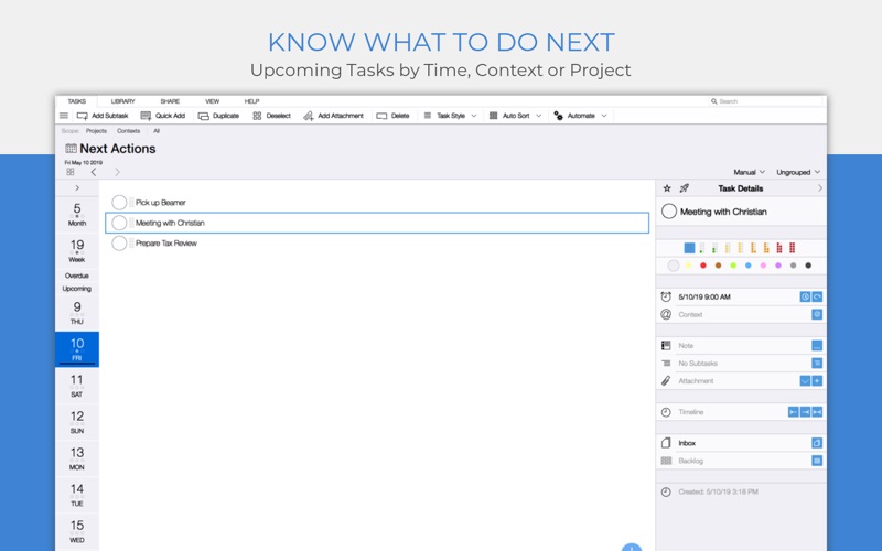 Your personal task manager - if you need to handle more than just a simple list! Organize:Me is easy to use for beginners and perfect for personal use. And if you need more, there's a whole family of products to support your business needs as well. Organize:Me helps you to cut complex situations down to what matters. With the built-in sync feature you can access your tasks with Organize:Me, Organize:Pro and Taskfabric for Windows, Mac, iPhone, iPad or Android. Take back Control over your Tasks with a simple 3-Step System to Manage your Tasks: 1. Capture your ideas and tasks – quick and easy, wherever you are! 2. Review and process your tasks – prioritize, delegate or share your tasks 3. Complete your tasks – and keep track of the results Easily create new tasks • Quick-Add shortcuts to "just write down" your task list • Create subtasks by drag and drop • Manage repeating tasks • Drop any File or Web Link on Organize to create a Task • Add Images, Documents and Web Links to any task Organize your tasks • Create subtasks by drag and drop • Assign an unlimited number of contexts to each task • Color code special tasks • Unlimited number of subtasks Powerful review features • Powerful date based review • Review by date, project or context • Scope Bar to quickly filter by Project or Context Project Handling • Supports Projects, Meetings and Folders • Project Status: Active, On Hold, Cancelled, Completed • Traffic Light: Green, Yellow Red • Color code special Projects • Unlimited number of Subprojects Context Handling • Use Contexts to identify people, locations or events relevant for your tasks • Assign locations to your Contexts • Color code special Contexts • Unlimited number of Subcontexts • Easily convert Address Book entries into Contexts All the basics covered • Sync with Organize:Me, Organize:Pro and Taskfabric for iPhone, iPad, Mac, Windows and Android • Really fast search feature • Quick access to completed tasks • Multiple sorting options for projects, contexts and task lists • Choose from different interface themes and colors • Share task lists with others by Email, Print or Export • Password Protection for your Tasks Organize:Me easily handles your task lists. Straightforward and really simple to use. For a complete feature list for all Organize editions have a look at our web site.