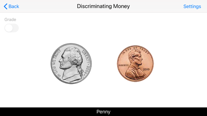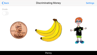 Three pictures of coins or bills appear on the screen. The program voice says (for instance) "Find Dime." The student chooses the dime from one, two, or three items on the screen. The default selections for this program are Level 3, Command Text, Prompt with Blink, Congratulatory Animation, and Select All. Settings Level 1 When this option is selected, one coin or bill appears at the top of the screen. One coin or bill is shown at the bottom of the screen to be matched with the one at the top, without any distracter. Level 2 When this option is selected, one coin or bill appears at the top of the screen. Two items (coins or bills or pictures) are shown at the bottom of the screen to be matched with the coin or bill at the top of the screen. There is one correct choice and one distracter. You can choose a coin or bill or non-money distracter. “Mixed" gets disabled. Level 3 This level is selected by default. One coin or bill appears at the top of the screen. When this option is selected, three items (coins or bills or pictures) are shown at the bottom of the screen to be matched with the coin or bill at the top of the screen. There is one correct choice and two distracters. You can choose one coin or bill or non-money, or “Mixed" distracter. Distracter Money This option is selected by default. When this is selected, distracters are all coins or bills. Non-Money If this option is selected, distracters are not coins or bills but some other items Mixed Distracters are either coins or bills or other items. Command Text This option is selected by default. When this is checked, the coins or bills to be selected appear at the bottom of the screen. If unchecked, the coins or bills won't be visible. Prompt Prompt with Blink This is checked by default. If the student fails to match the correct coins or bills within ten seconds, the program guides him/her to the correct coin or bill by making the coin or bill blink. This is available for “Training" mode but disabled for “Test" mode. Prompt with Label If this box is checked the value of the coin or bill appears under the picture of the coin or bill. When this is checked, “No Label under Coin or Bill" is unchecked, and vice versa. Prompt with Animation If the student fails to match the correct coins or bills within ten seconds, the program guides him/her to the correct coin or bill by making the coin or bill Animation. Congratulatory Animation This box is checked by default. This is available only for the “Training" mode. When this is checked, clicking the correct coins or bills invites a congratulatory animation. This animation runs for ten seconds. Click anywhere on the screen or press space bar to stop the congratulatory animation. Uncheck the box if the student doesn't need congratulatory animation. Selection Click on the check box to select or deselect the coins or bills. Select All Check this box to select all coins and bills. Uncheck to deselect. OK Click this button to open this program after choosing settings. Done Click this button to close the program and return to the main program.