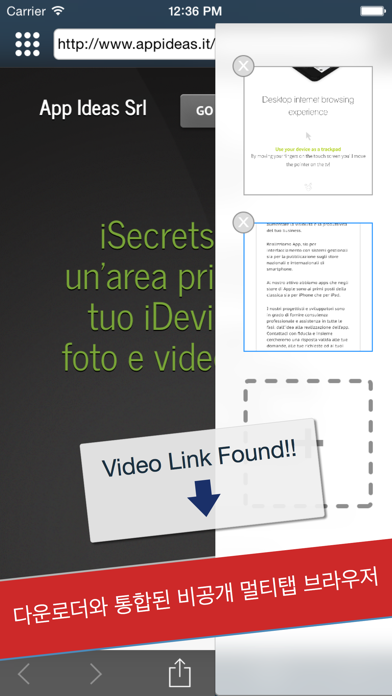iSecrets는 장치에서 비디오, 사진, 문서 다운로드 기능이 있는 빠른 멀티탭 브라우저를 사용하는 비밀 영역을 만들 수 있는 최고의 앱입니다. iSecrets를 사용하면 다음 을 숨기고 보호할 수 있습니다. * 사진 * 비디오(Flv, Avi, Wmv, Mkv 등 비표준 비디오 포맷도 지원) * 문서(PDF, 텍스트 - 생성 및 수정 가능 -, PowerPoint, Word, Excel, Pages, Key, Numbers 등) * 보호된 TXT 파일의 개인 PIN 및 비밀번호 * 사진 * 비디오(비표준 비디오 형식도 지원 가능, Flv, Avi, Wmv, Mkv 등) * 문서(PDF, Text - 생성 및 수정할 수 있습니다. PowerPoint, Word, Excel, Pages, Key, Numbers 등) * 보호된 TXT 파일에 있는 개인 PIN 및 비밀번호 * iSecrets는 다음으로부터 미디어 파일을 가져올 수 있습니다. - 모든 파일을 백그라운드에서 다운로드할 수 있는 놀라운 멀티탭 통합 브라우저로 인터넷에서 가져오기 - 카메라롤을 사용하지 않고 장치 카메라에서 가져오기 - USB로 iTunes를 사용하여 PC 또는 MAC에서 가져오기 - 간단한 드래그 앤 드롭으로 초고속 Wi-Fi 연결을 사용하여 문서, 사진, 비디오 및 전체 무비 가져오기! - 카메라롤: iSecrets는 사진의 원래 품질과 크기를 유지합니다. 다른 많은 어플리케이션은 품질을 떨어뜨립니다! - 친구와 앨범을 찾고 탭 한 번으로 여러 장의 사진을 다운로드할 수 있는 통합된 기능으로 FACEBOOK 앨범(나와 내 친구들)에서 가져오기 * 보안 - 패턴 기반 로그인: 점을 연결하여 액세스하세요! - 액세스 로그: iSecrets는 모든 미디어 접근 시도를 추적하고 GPS 좌표를 저장하여 침입자의 사진도 보관합니다! - 패닉 제스처: 화면에 손을 올리거나 스마트 커버를 닫아 즉시 로그아웃하세요(iPod 및 iPad1에서는 지원되지 않음) - 잠금해제 패턴을 잊었을 경우에 사용할 추가 비밀번호 * 파일 정리 및 공유 - 혼합 및 정리된 파일 컨텐츠(사진, 비디오, 문서)의 무제한의 컬렉션을 생성 - 컬렉션 간에 사진, 비디오, 문서를 이동하거나 복사하기 위한 다중 선택 - 길게 탭하여 사진 및 비디오를 카메라롤 또는 라이브러리에 저장 - 컬렉션의 구성요소 재배열 - Facebook, Twitter 또는 이메일로 사진 공유 * 파일 뷰어 - 확대/축소 및 스와이핑 멀티터치 기능으로 컬렉션의 사진 보기 - 슬라이드 쇼 기능 및 효과로 사진 보기(2-3-5-10-20-30초) - AirPlay가 지원되는 통합된 플레이어를 사용하여 컬렉션의 비디오 보기 - 사진 자르기 * 통합된 브라우저 기능 - 매우 간단한 비디오 다운로드 기능: 비디오를 시작하여 직접 다운로드 링크를 띄우세요!! - 링크를 길게 탭하여 백그라운드 다운로드를 시작하세요. - 멀티탭에서 빠른 인터넷 브라우징 - 폴더 지원 기능으로 향상된 북마크 및 기록 관리 - URL 자동 완성 및 검색어 제안 - 빠른 검색 - 새 탭(또는 새 백그라운드 탭)에서 링크 열기 - 사용자 에이전트 스푸핑 * WiFi 기능 및 iDevices 간 동기화 - iDevices(iPad, iPhone, iPod) 간에 컬렉션을 동기화할 수 있는 간단하고 빠른 동기화 기 - 브라우저에서 사진을 다운로드하고 볼 수 있는 WEB 액세스 - 동시에 여러 개의 파일을 업로드할 수 있는 FTP 액세스 - iTunes 파일 공유로 USB에서 가져오기
