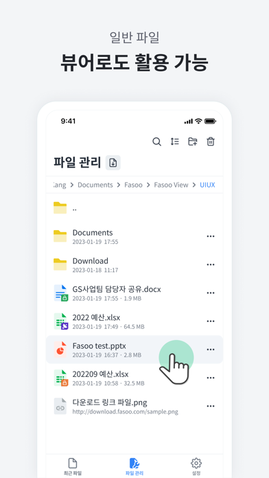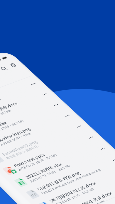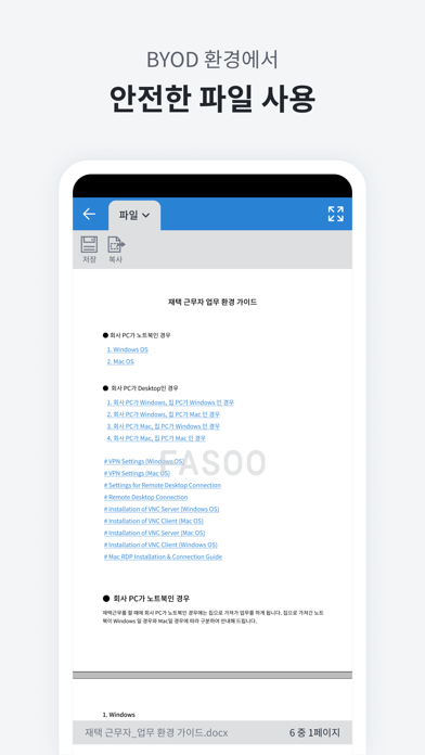 Fasoo View Plus는 모바일 기기에서 문서를 안전하게 열람하고 편집할 수 있도록 하는 애플리케이션입니다. Fasoo View Plus를 통해 스마트폰과 태블릿에서도 PC 환경과 동일하게 안전하게 문서를 사용할 수 있어, 안전하고 스마트한 모바일 업무 환경을 구축할 수 있습니다. ※ Fasoo View Plus는 파수닷컴의 모바일 보안솔루션 Fasoo Mobile Solution 사용자만 사용이 가능한 애플리케이션입니다. Fasoo Mobile Solution은 모바일 기기에서도 문서 사용 권한을 제어하고 사용 내역을 추적하여, 모바일 에서도 원천적이고 지속적인 보안 환경을 제공하는 보안 솔루션입니다. 일반 사용자는 사용이 불가능합니다. 기능 - Fasoo View 애플리케이션의 모든 기능을 포함 (Fasoo View : https://itunes.apple.com/kr/app/fasoo-view-for-ios/id444651561?mt=8) - 문서 사용 권한에 따라 내용 복사, 붙여넣기, 암호화해제 등 편집 기능 - 위치 기반의 문서 사용 권한 제어 - 위치 기반의 문서 사용 내역 전송 및 조회 ※ 백그라운드에서 GPS 사용은 배터리 수명을 단축시킬 수 있습니다. 지원파일 1) 열람 / 편집 지원 - MS Word 97 ~ (*.doc, *.docx) - MS PowerPoint 97 ~ (*.ppt, *.pptx) - MS Excel 97 ~ (*.xls, *.xlsx) - 텍스트파일 (*.txt) 2) 열람 지원 - MS Word 97 ~ (*.dot, *.dotx) - MS PowerPoint 97 ~ (*.pps, *.ppsx. *.pot, *.potx) - MS Excel 97 ~ (*.xltx, *.csv) - 아래아한글 97~3.0, 2002~2014 (*.hwp) - Adobe PDF 1.2 ~ 1.7 (*.pdf) - 텍스트파일 (*.asc) - 이미지파일 (*.bmp, *.jpg, *.png, *.gif, *.wmf, *.emf, *.jpeg, *.tiff)