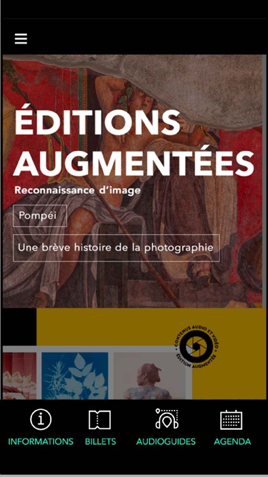 L'application est gratuite. Découvrez toutes les expositions et tous les événements en cours et à venir. Les expositions organisées par la Rmn-Grand Palais vous sont annoncées directement dans l'application, ainsi que les foires et événements de ses partenaires. Enrichissez votre visite avec les parcours audioguidés et des parcours découvertes. Comment fonctionne-t’elle? Que contient-elle? -un agenda vous informe de l’ensemble des événements en cours et à venir; -un accès direct à la billetterie des événement et expos Grand Palais hors-les-murs; -La possibilité d'importer vos billets de visite dans l'application; -La programmation culturelle (conférences, concerts, films…) et des différents espaces du Grand Palais, autour des expositions (représentations vivantes, événements …) sont également annoncées; -Un service de notifications (si vous le souhaitez) vous communique des informations importantes, les temps forts, pour préparer votre visite en toute sérénité. Enrichissez votre visite à l’aide de parcours gratuits et payants : Plusieurs types de parcours sont proposés pour différents usages et différents publics, diversifiant ainsi les expériences : Des parcours gratuits conçus selon les thématiques des l’expositions : -des parcours l'"Exposition " expliquent l'exposition, suivant ses grandes thématiques; -des parcours découverte reprennent une thématique de l’exposition et la développent ; -des parcours innovants : ils mettent en avant une fonctionnalité plus poussée : la reconnaissance d’image, par exemple. -des parcours ludiques : varient selon les thèmes des expositions. Des parcours payants audioguidés — enrichis des reproductions des œuvres commentées, avec textes écrits et localisation sur le plan de l’exposition —sont proposés pour chaque exposition, pour adulte et pour enfant. Ils sont téléchargeables, en achats intégrés, avant, pendant, et après la visite. Accessibilité pour le plus grand nombre: L’interface de l’application est conçue pour une meilleure lisibilité des textes. Des parcours en audio-description gratuits y sont mis à disposition des malvoyants. Les œuvres des parcours peuvent être mises en favoris; vos notes associées à vos photos personnelles sans quitter l’application, puis être partagées. Enrichissez votre lecture avec nos éditions augmentées: scanner des images de certaines de nos publications, (Pompéi, Une brève histoire de la photographie,…) et visualiser en reconnaissance d'image vidéos, images en haute définition.