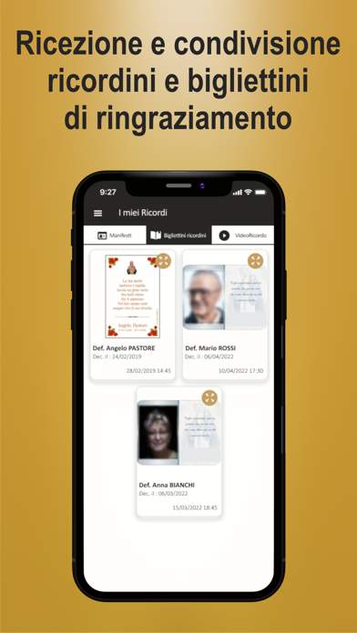 App mobile Bonomi è la prima ed unica app mobile gratuita del lutto: l’intermediario virtuale tra la famiglia coinvolta nella perdita di una persona cara e chi sente la necessità di partecipare al loro dolore; il supporto tecnologico che ti serve per essere sempre connesso e aggiornato nel difficile momento della morte di una persona vicina. L’app mobile Bonomi è una risorsa tecnologica valida per essere vicino e sostenere la famiglia del defunto, contribuendo alla creazione di una comunità virtuale unita, anche se lontana fisicamente, in un sentimento umano di vicinanza ed affetto: grazie ai nostri sistemi ed un semplice click, è possibile inviare messaggi di cordoglio ai famigliari del defunto, e ricevere bigliettini e ricordini di ringraziamento della persona scomparsa da ogni parte dell’Universo! Riceverai notifiche in tempo reale di chi è deceduto oggi e potrai conoscere tutte le informazioni utili riguardo al decesso e alle esequie, con un’ampia possibilità di interazione con le famiglie colpite dal lutto e con la nostra agenzia funebre Bonomi, sempre a vostro servizio anche nell’ambito dell’innovazione mediatica e tecnologica! Non è più necessario consultare i manifesti funebri affissi per le strade, con la nostra app è semplice e veloce visualizzare la geolocalizzazione su Google Maps del luogo della veglia, delle esequie e della tumulazione. Gratis per sempre come la morte, l’app mobile Bonomi è sempre in grado di aiutarvi a partecipare ed interagire, anche se virtualmente, al triste evento della perdita di una persona cara: consultando il nostro ampio archivio dei servizi funebri, basterà una semplice ricerca inserendo il nome del defunto o la data del decesso e troverai all’istante tutte le notizie che cerchi! Il marchio Bonomi è sinonimo di serietà, professionalità e cortesia, al servizio delle famiglie martinesi e non: con la nostra app mobile sei sempre aggiornato sulle nostre news, potrai comunicare con l’agenzia o inviarci documenti in modo privato con semplicità e rapidità, da ovunque e in totale mobilità. Nel difficile momento del lutto, l’app Bonomi rende tutto più facile e veloce, rendendo immediati e a portata di click anche i ringraziamenti per il funerale: è importante non dimenticare di esprimere la propria gratitudine a chi ha mostrato affetto e si è unito al sentimento di vuoto e tristezza per la morte del proprio caro. La nostra app è affidabile e seria, vi accompagna virtualmente nel momento del cordoglio, proponendovi una vasta gamma di servizi tra i quali anche una sezione dedicata dove è possibile prendere visione di tutti i nostri partners e mettervi in contatto con loro direttamente dal tuo smartphone e tablet! Creata dagli sviluppatori del software gestionale per agenzie funebri Funeral Business Expert, l’app mobile Bonomi garantisce un servizio di prima qualità nell’innovazione mediatica e tecnologica nell’ambito funebre, con l’obiettivo di allietare e dare conforto alle famiglie che vivono la difficile esperienza del lutto. Con l’app mobile Bonomi potrai visualizzare: • giorno per giorno, gli annunci di decesso gli anniversari e i manifesti di partecipazione. • la geolocalizzazione tramite Google Maps del luogo della veglia, delle esequie e della tumulazione • tutti i nostri partners con la possibilità di metterti in contatto con loro • il nostro intero archivio dei servizi funebri e potrai inviare e ricevere: • messaggi di cordoglio direttamente alla famiglia • messaggi e bigliettini di ringraziamento • ricordino del defunto in ogni parte d’Italia • comunicazioni e messaggi all’agenzia Bonomi, documenti in modo privato con semplicità e velocità.