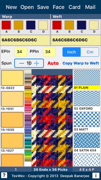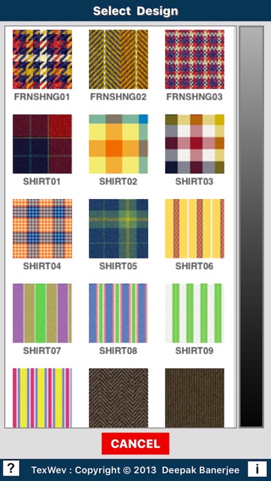 TexWev is a revolutionary designing tool for the iPhone created specially for the textile designer. Create a collection of woven designs right on you iPhone with just a few drag - drops !! The simple user-interface allows you to realise your creative potential while having fun in the process ! A detailed user-guide is included in the app ( tap on "?" at the bottom left of the main screen to open the guide ). Realistic fabric look in near actual size (based on the end and picks entered). TexWev users can send / receive designs to / from other TexWev users via email. Communication between iPhones (and iPads using TexWev) allows design teams to communicate and share their ideas instantly. TexWev is an ideal companion for every creative designer. The attached design can be opened from within the email. The design can then be edited and/or saved to the local design library on the your iPhone. * * * * * * Following are some of the salient features of TexWev : Fabric Effects *************** - Variety of fabric effects like yarn dyed stripes and checks (plaids) with different structure effects are nicely displayed. - Typical effects like Mellange, Indigos and Natural Spun effects are closely represented. - Realistic weave effects are represented in fabrics. - Fabric images are displayed in near actual size. - View a single repeat of the design provided the pattern and weave are exactly matched in ends and picks. -The 'Spun' option brings to life the displayed fabric, simulating effects of yarn's natural unevenness. - Auto Pattern feature to create random new patterns from a given design. Pattern Editor *************** - The Warp / Weft pattern is input using text format. This is simple method and easy to understand. A pattern like 4A4B would denote 4 threads (ends or picks) of Color A followed by 4 threads of Color B, and so on. 4 colors are available in the Warp and Weft respectively. A pattern can be of a maximum of 1200 ends and 1200 picks; - While copying the warp pattern to weft, the software automatically adjusts the weft pattern to the closest equivalent based on the ratio of the ends/inch (or ends/cm) to the picks/inch (or picks/cm). Ready Libraries Of Weaves And Colors ******************************************* - A ready library of 40 most commonly used weaves comes bundled with. To use a particular weave just drag the weave from the library and drop it on the fabric area. - In addition users can edit another 40 weaves of their own using the simple weave editor. The maximum limits for a weave repeat are 40 ends x 40 picks. - A color library of 2000 colors is provided. Each of these colors can be customised and saved with a name. - To use a certain color in a pattern simply drag it from the color library and drop it at the Color position in the warp/weft pattern. Cloth Swatch and Card ************************* - A large design swatch of the current design is displayed at the tap of a button. - A simple cloth card containing the design swatch, pattern and weave details of the current design is displayed at the tap of a button. - Both the above views can be saved to the photos album or emailed from within the app. Excellent communication tool ********************************* The design file or its swatch/cloth card can be emailed to other TexWev users (iPad or iPhone) providing a interactive environment among a team of designers, merchandisers and fabric manufacturers. * * * * * * * * * * * * * * * * * * * * TexWev is an essential value addition to any iPhone owner interested in designing woven textile fabrics. * * * * * * * * * * * * * * * * * * * * Disclaimer ======= The simulations of colors in the color library are not in any way a substitute for standard physical colors or any color publication.