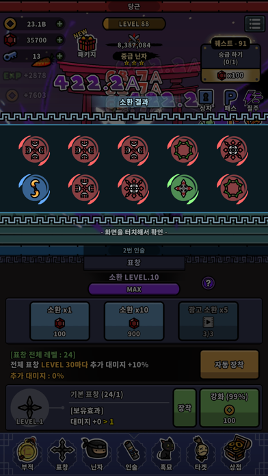 끝없이 수련하고 도전하는 닌자 AFK RPG 게임 수련으로 인술을 갈고 닦아 전설의 닌자로 키워보세요! 숨겨진 고수가 평생을 찾아 헤맨 '닌자의 전설이 될 그릇을 갖춘 자' 그 사람이 바로… 나?! ▶ 방치만 해도 성장하는 나만의 캐릭터! 방치형(IDLE) 키우기로 손쉬운 레벨 업! 접속하지 않아도 금화와 경험치를 획득할 수 있어요. ▶ 매력만점 닌자와 표창 수집! 귀여운 흑묘와 함께할 개성 넘치는 닌자들을 소환하고, 화려하고 강력한 표창을 모아 적들을 쓸어버리세요! ▶ 수련과 승급으로 끊임없는 성장! 오직 열혈닌자에서만 느낄 수 있는 화려한 인술! 강해질수록 더욱 속도감 넘치는 전투로 화끈한 재미를 느껴보세요. ▶ 부적을 강화하고 타겟을 무찔러라! 질주와 대련을 즐기다 보면 어느새 레전드(legend)가 되어있을 거에요!