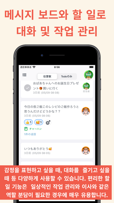 ienon: 소중한 사람과의 일상을 더욱 연결하는 올인원 앱 ienon은 가족이나 연인 등 함께 사는 소중한 사람과의 일상을 더욱 연결하고 유대를 깊게 하는 '가정'을 위한 올인원 앱입니다. ○ 함께 사는 가족과 연인이 공유하는 '가정' 앱 같은 그룹의 멤버와 ienon의 모든 기능을 공유할 수 있습니다. (프라이빗 기능 제외) ○ 올인원 공유 앱 ienon에는 캘린더, 쇼핑 리스트, 가계부, 메시지 보드, 노트(레시피, 메모 등), To-do 리스트, 기념일, 기분 기록, 집안일 관리, 식단・레시피, 재고 관리 리스트(※프리미엄 전용 기능)가 하나의 앱에 담겨 있어 모두 공유할 수 있습니다. ienon은 다기능 앱이지만, 모든 기능은 소중한 사람과의 일상을 더욱 연결한다는 목적을 가지고 있습니다. 캘린더로 일정을 공유하고, 메시지 보드로 소통하며, 가계부로 함께 가계를 관리하는 등, 이 모든 것이 일상의 작은 연결을 소중히 하는 마음에서 비롯되었습니다. 모든 기능을 사용하지 않아도 OK! 라이프스타일에 맞춰 자유롭게 사용해 보세요 공유할 수 있는 기능 ①캘린더 기능 ienon의 캘린더 기능을 사용하면 가족이나 연인, 파트너와 일정을 공유할 수 있습니다. 서로의 일정을 파악하여 중요한 이벤트나 약속을 놓칠 걱정이 없습니다. 주의 시작일이나 공휴일 색상, 이벤트 텍스트 색상 등을 자유롭게 커스터마이즈할 수 있습니다. ②메시지 보드 기능 마음을 전하고 싶을 때, 대화를 즐기고 싶을 때, 문득 든 생각을 적고 싶을 때 등 사용 방법은 무한대입니다. 메시지에 스레드 형식으로 답장하거나 스티커로 빠른 감정 표현을 하는 등 대화를 즐길 수 있습니다. 바쁘게 흐르는 일상 속에서도 ienon의 메시지 보드가 있다면 언제든 소중한 사람과의 연결을 느낄 수 있습니다. ③To-do 리스트 기능 할 일 리스트를 작성할 수 있습니다. 일상적인 할 일 외에도 이사 준비나 결혼식 준비 등 역할 분담이 필요할 때도 유용합니다. ④노트 기능 자유롭게 노트를 작성하여 공유할 수 있습니다. 레시피, 일기, 메모나 가고 싶은 곳 리스트 등 사용 방법은 자유입니다. 소중한 사람과 함께 작성하는 즐거움도 느낄 수 있습니다. 추억을 함께 되돌아보거나, 서로의 마음을 글로 전하거나, 여행 계획을 함께 세우는 등 노트를 통해 소중한 사람과의 유대가 더욱 깊어집니다. 이미지 첨부 기능도 있어 노트를 이미지로 꾸밀 수도 있습니다. (이미지 첨부는 프리미엄 전용 기능입니다) ⑤쇼핑 리스트 기능 쇼핑 리스트를 작성하여 공유할 수 있습니다. 사고 싶은 것을 휙휙 적기만 하면 즉시 리스트화되어 매우 편리합니다. 알림 기능도 있어 같은 그룹의 사람에게 쇼핑 리스트를 작성했음을 알릴 수도 있습니다. ⑥기분 기록 기능 기분 기록에서는 그날의 기분이나 생각을 기록하여 공유할 수 있습니다. ※기분 기록을 사용하지 않는 분은 아래 순서로 숨길 수도 있습니다. 일상의 감정을 기록하는 것은 자신의 멘탈 케어에도 도움이 됩니다. 자신의 마음과 마주하는 습관은 함께 사는 소중한 사람과의 관계에도 좋은 영향을 미칠 수 있습니다. 또한, 소중한 사람과 감정을 공유함으로써 평소에는 알아채지 못하는 상대방의 마음을 엿볼 수 있을지도 모릅니다. "오늘은 이런 기분이었구나" "원기 있어 보이는데 실은 몸 상태가...?" 등, 깨달음과 배려의 계기를 만듭니다. 시간이 흐르는 것은 빠릅니다. 그렇기에 ienon으로 소중한 사람과의 일상을 기록하고 공유해 보시는 건 어떨까요? "기분 기록"을 통해 소중한 사람과의 연결이 더욱 깊어지고, 자신도 소중히 여길 수 있는 시간이 늘어나기를 바랍니다. ⑦가계부 기능 라이프스타일에 맞춘 가계부 관리가 가능합니다. 마감일 변경 등 자유롭게 커스터마이즈할 수 있습니다. ⑧기념일 기능 기념일 기능으로 소중한 사람과의 특별한 날을 기록할 수 있습니다. 기념일 등의 중요한 날을 등록하면 자동으로 그날까지의 카운트다운 & 카운트업이 계산되어 표시됩니다. 만난 지 몇 일이 지났는지, 기념일까지 얼마나 남았는지, 소중한 사람이 태어나서 얼마나 많은 시간이 흘렀는지 등을 한눈에 확인할 수 있습니다. 기념일을 캘린더에 연동할 수 있습니다. ⑨집안일 기능【NEW】 집안일 분담・관리가 가능한 기능입니다. 템플릿에서 선택하거나 자유롭게 집안일을 등록하여 일정 관리를 할 수 있습니다. 반복 설정(매일/매주/요일 지정 등)도 지원합니다. 집안일을 완료하면 포인트를 받을 수 있고, 모은 포인트로 '보상'과 교환할 수 있습니다. 대시보드에서는 랭킹, 통계, 완료 기록을 확인할 수 있어 가족 모두가 즐겁게 집안일에 참여할 수 있습니다. "누가 얼마나 했는지"가 시각화되어 감사의 마음이 자연스럽게 생겨납니다. ⑩식단・레시피 기능【NEW】 주간 식단을 아침・점심・저녁 3개 슬롯으로 계획할 수 있습니다. 나만의 레시피 라이브러리를 만들고 태그로 정리할 수도 있습니다. 레시피 사이트의 URL에서 레시피를 가져오거나 AI에게 레시피를 상담할 수도 있습니다(※프리미엄 기능). 레시피의 재료는 1탭으로 쇼핑 리스트에 추가할 수 있어 식단 계획부터 쇼핑까지 매끄럽게 연결됩니다. "오늘 뭐 만들지?"의 고민을 해결하