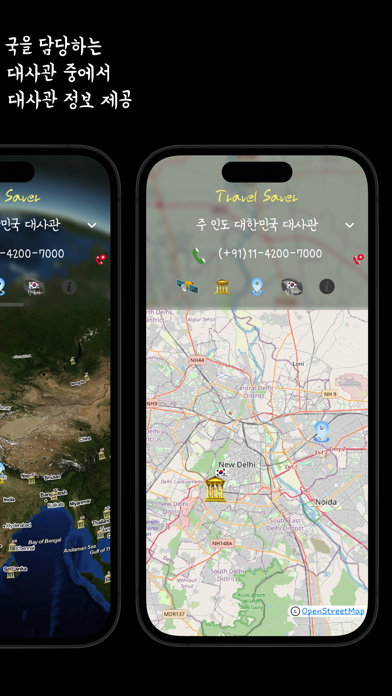 전 세계 240개국 중에서 위치에 따른 긴급 전화번호와 대사관 정보를 제공합니다. 또한 지구본에서 국가를 선택하고 해당 국가의 긴급 전화번호를 알 수 있습니다. 온라인 지도 기능을 사용하여 정확한 지도를 볼 수 있습니다. 전 세계 197개국을 담당하는 183개의 대한민국 대사관 & 영사관의 위치와 비상시 도움을 줄 외교관의 전화번호를 제공합니다. *온라인 지도 기능을 제외하고 네트워크 및 유심카드 없이 작동합니다.