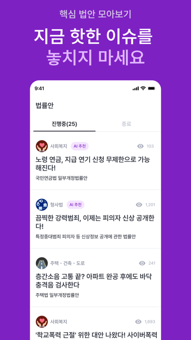◆ 주요 기능 ◆ 1. 법안 정보 - 국회 본회의를 통과한 핵심 법안 필터링 - 복잡한 법안 Ai 요약 - 이슈 법안 Ai 추천 2. 투표 & 토론 - 법안 찬성, 반대 투표 & 토론 - 법안 찬성, 반대 여론 Ai 요약 3. 이슈 토론 - 온라인 정치 커뮤니티 - 이슈 찬성, 반대 투표 & 토론 ▶필수 권한 • 없음 ▶선택 권한 • 없음 ▶저작권 표시 • https://bit.ly/3TonBvb ▶법률안 출처 • 대한민국 국회 의안정보시스템(https://likms.assembly.go.kr/bill/main.do)
