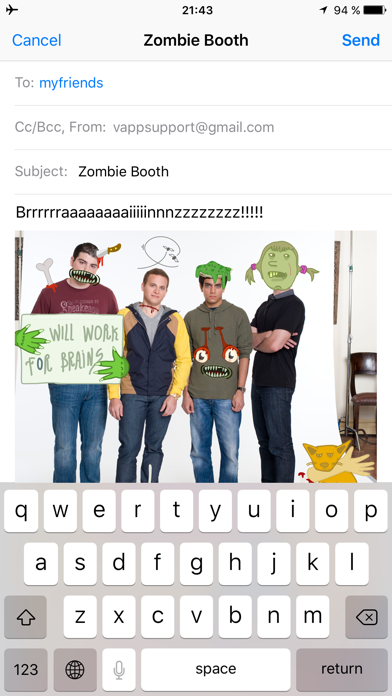 Zombies are all around you. Even your friends! Zombie Booth lets you create nice and fun zombie theme photos and share them with your friends in just few taps! Features: * Add nice zombie theme stickers to your photos: heads, bones, brains, eyeballs - fill you photos with funny horror ! * Add your zombie sticker live at photo taking time! * Share your photo in just few taps! Have fun and surprise your friends!