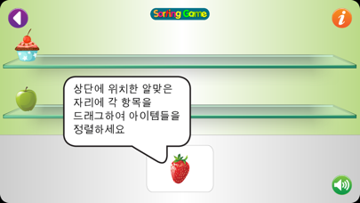 유아의 놀이방 정리정돈이 이보다 더 재미 있었던 적이 없습니다. 이 재미난 분류 응용 프로그램으로 자녀에게 분류 및 배열하는 법을 가르치십시오. 이 응용 프로그램은 개념, 시각 인식 및 미세 운동 능력을 개발하는 데 도움이 됩니다. 부모님의 도움으로 언어 능력도 개발할 수 있습니다. Sorting Game 은 2 세 이상 아동을 위해 설계되었습니다. Sort It Out 1 은 3 세 이상 아동을 위해 설계되었습니다. Sort It Out 2 은 4 세 이상 아동을 위해 설계되었습니다. 놀이 방법: 상단에 위치한 알맞은 자리에 각 항목을 드래그하여 아이템들을 정렬하세요. 이 게임은 MyFirstApp.com이 어린이들을 위해 제공하는 일련의 교육용 게임들 중 하나입니다. 배우고, 놀고, 탐험하고 실험하는 것은 아이들이 가장 잘 하는 것들입니다. 아이들은 자신 주변의 흥미를 갖게 되고 재미있는 세상에 매료됩니다. 터치패드의 혁명은 완전히 새로운 게임 세상을 진화시켜 어린 아이들에게 새로운 지평을 열어줍니다. 따라서, 어린 아이들은 이제 다양한 색깔의 흥미 넘치는 새로운 게임들을 즐기면서 인지적이면서도 미묘한 새로운 자동차 기술들을 익힐 수 있게 되었습니다. MyFirstApp.com은 풍성하게 하는 이런 새로운 세상을 어린 아이들의 호기심 넘치는 작은 손가락들에 가져다 줍니다.