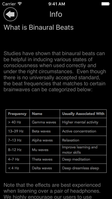 Ever wanted to tap into the potentials of the mind and trigger your deeper consciousness? Now you can! With Binaural Beats Mint, you will be able to induce various states of consciousness when you adjust the playback frequencies on both ears to certain beat frequencies that matches to certain brainwave frequencies. High quality synthetic noise and tranquil water sound are also provided. You can even mix everything with your favorite music from the same iPhone/iPod and design your own moment of meditation. HIGHLIGHT - Simple to use interface - everything at your fingertips - Easy to understand, predefined activity levels for the binaural frequencies - Allows for mixing of binaural beat with any audio track on your device - Versatile controls for volume and equalization FEATURES - Home screen provides easy access to enable/disable noise mix - Slider allows easy adjustment of the binaural frequency - In-app help that provides a great description of intended effect of various binaural frequency - Independent sound level controls for binaural tones, water and noise sounds - Equalizer allowing for flexible control over treble and bass of the water and noise sounds - Allows mixing of binaural frequency with any audio track currently stored on your device DISCLAIMER While we want to promote the usage of app, safety is always the first priority and as such, as with any listening experience: - Do not subject yourself to extended periods of listening stress - Do not use whilst driving or operating any kind of machinery - Do no use under influence of alcohol or drugs - Stop using immediately if you experience any discomfort - Stop using immediately if you believe you are experiencing any negative side effects as a result of its usage Mint Muse will not be held responsible for any super or sub-human abilities as a result of usage of this app. Usage of this app implies agreement to our terms and conditions.